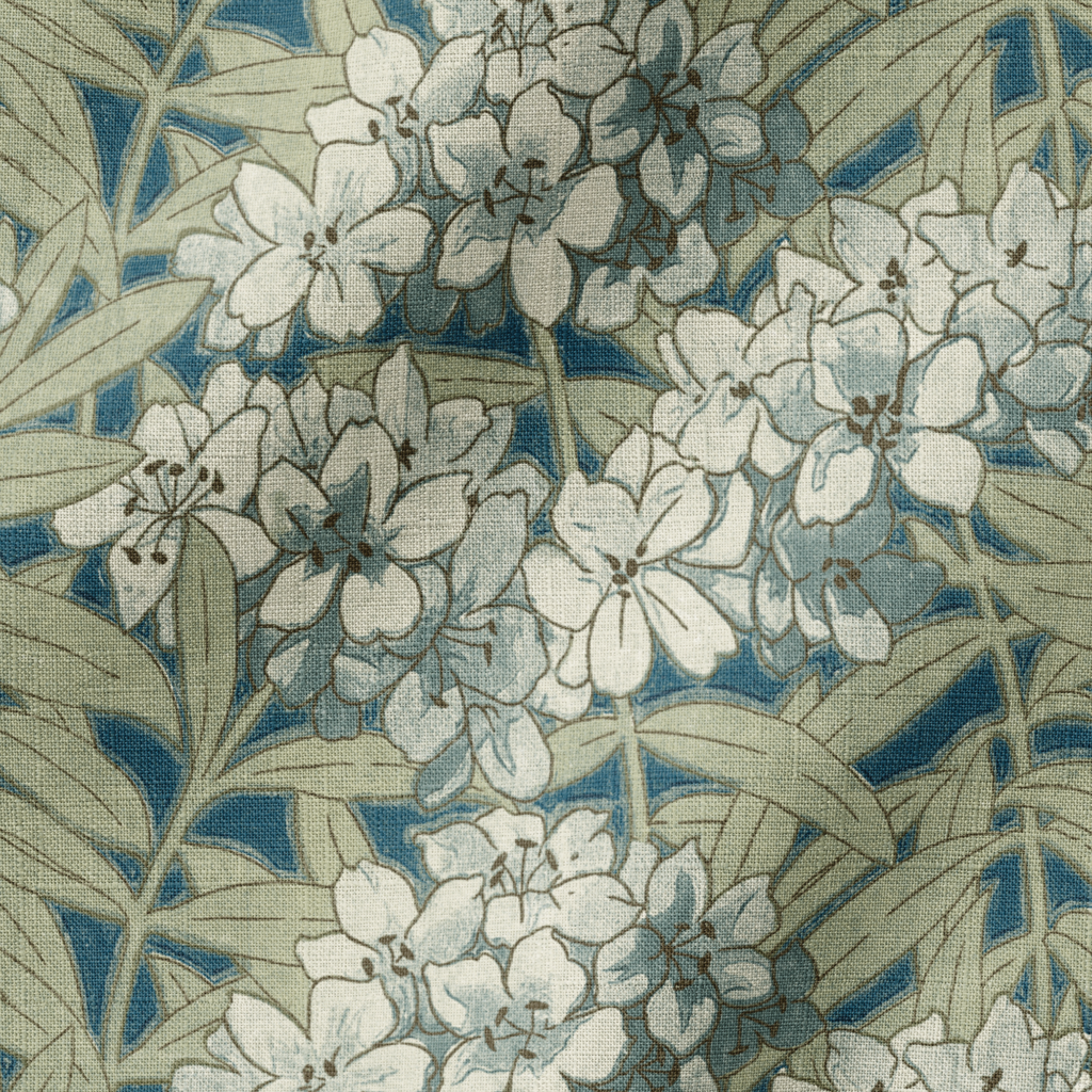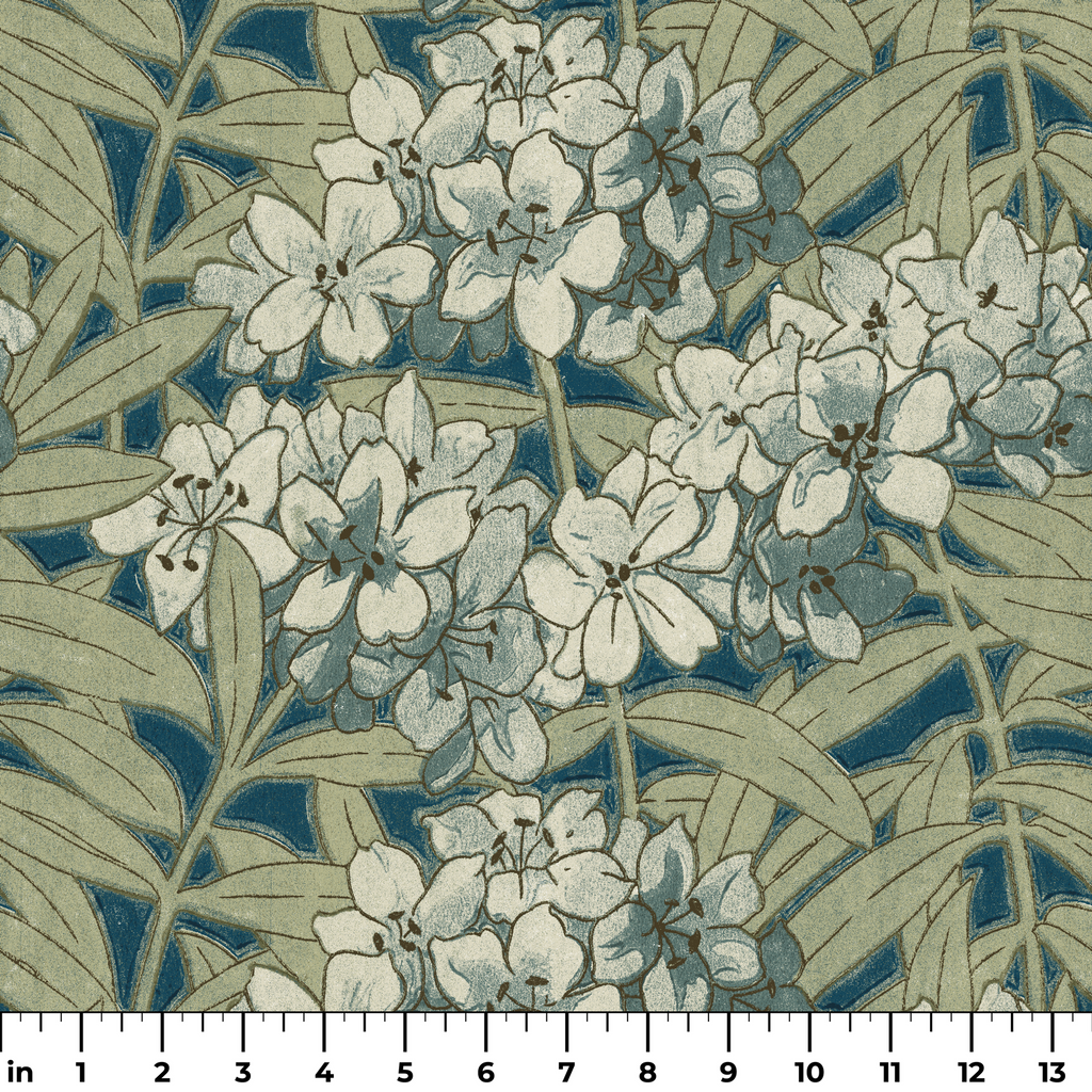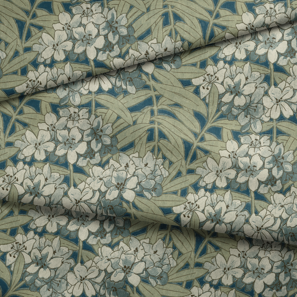 Elegant vintage floral illustration featuring delicate cream blooms against a deep blue background, with graceful olive-green foliage creating a timeless botanical pattern perfect for any home.