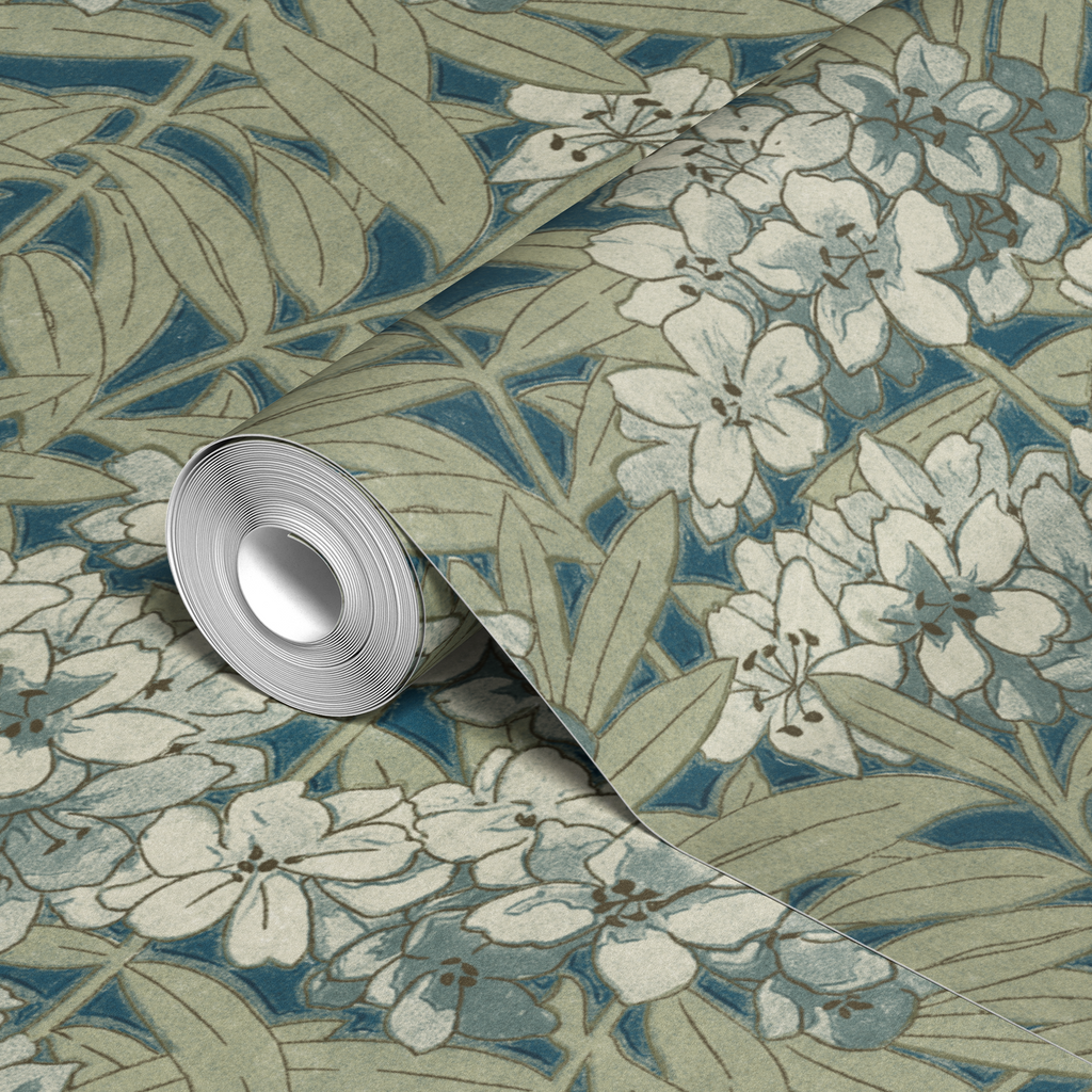 Elegant vintage floral illustration featuring delicate cream blooms against a deep blue background, with graceful olive-green foliage creating a timeless botanical pattern perfect for any home.
