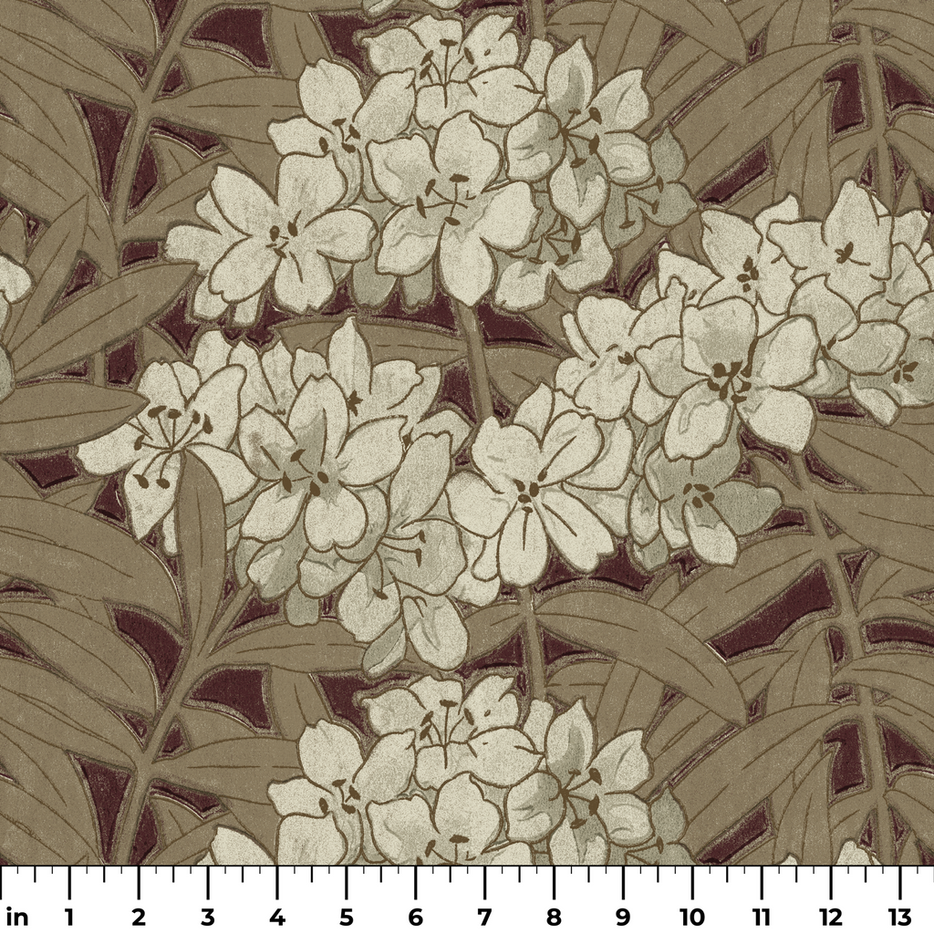 Elegant vintage floral illustration featuring delicate cream blooms against a burgundy background, with graceful dark brown foliage creating a timeless botanical pattern perfect for any home.