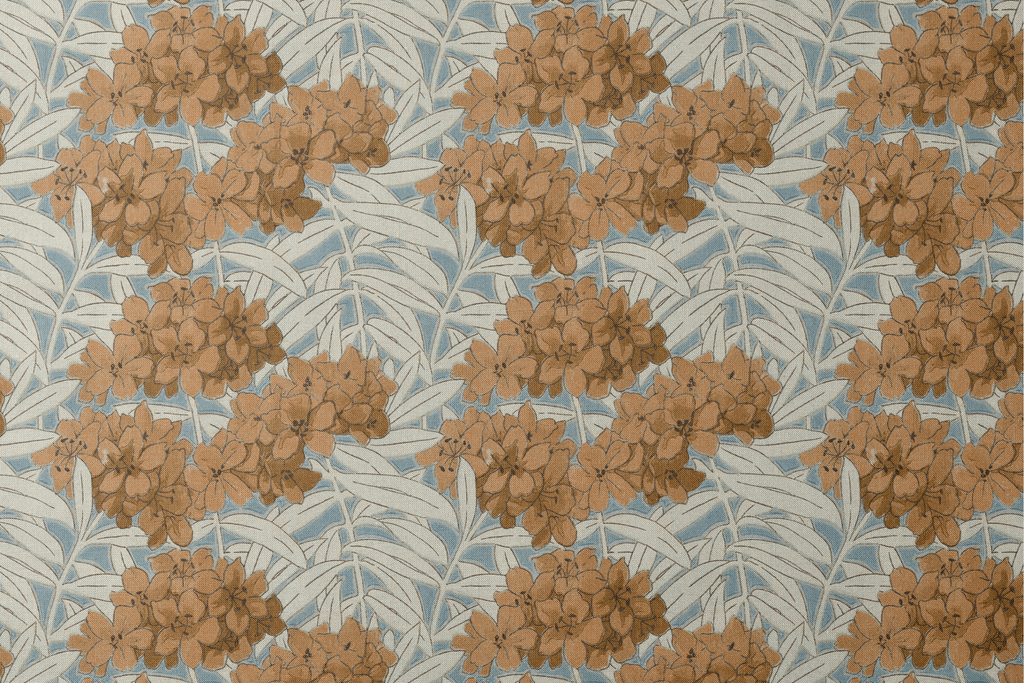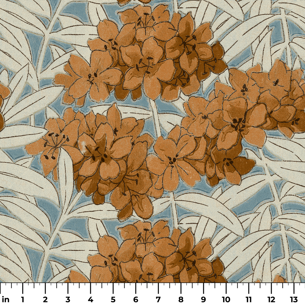 Elegant vintage floral illustration featuring delicate orange-brown blooms against a pale blue background, with graceful cream foliage creating a timeless botanical pattern perfect for any home.