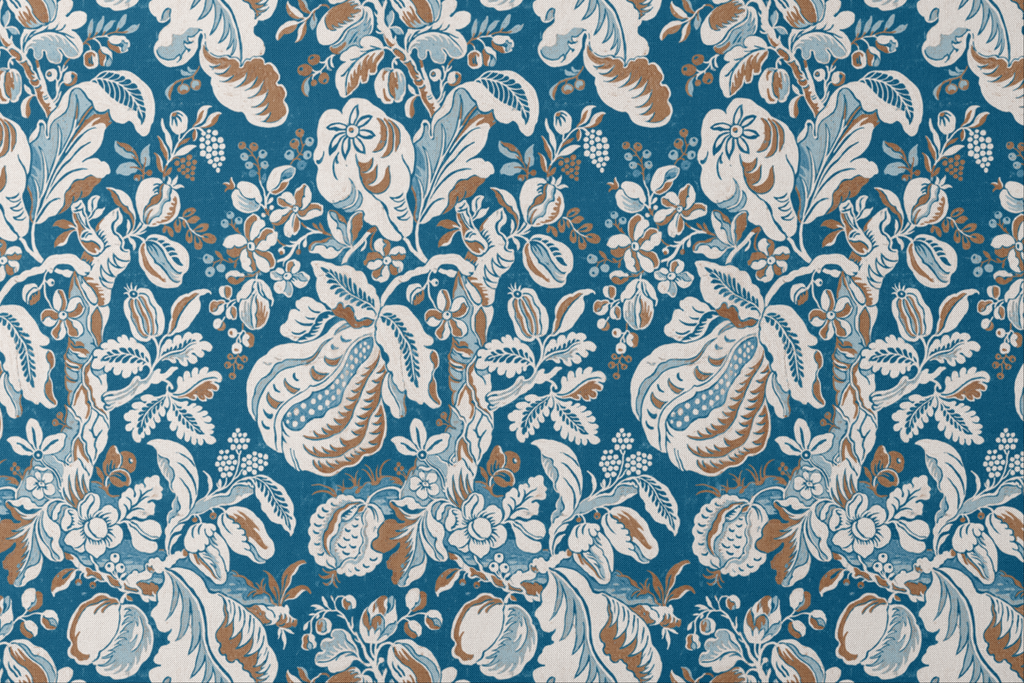 Elegant paisley pattern in brown and ivory tones on a blue background, perfect for a classic interior look.