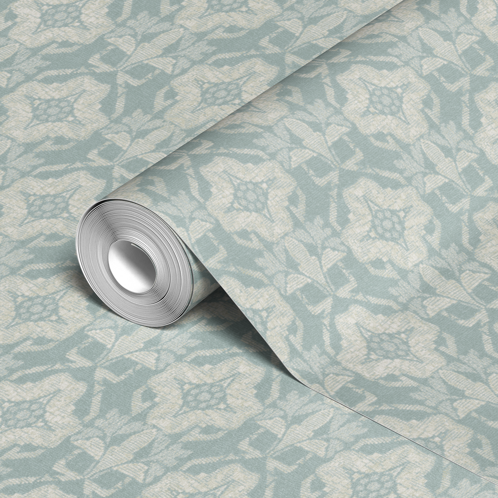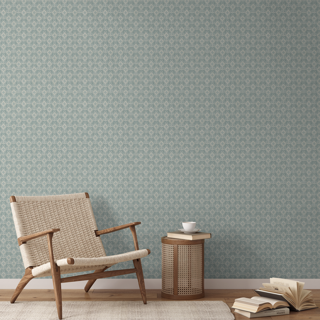 Elegant vintage damask pattern in pale blue featuring symmetrical floral motifs and organic shapes, perfect for heritage-inspired home accents.