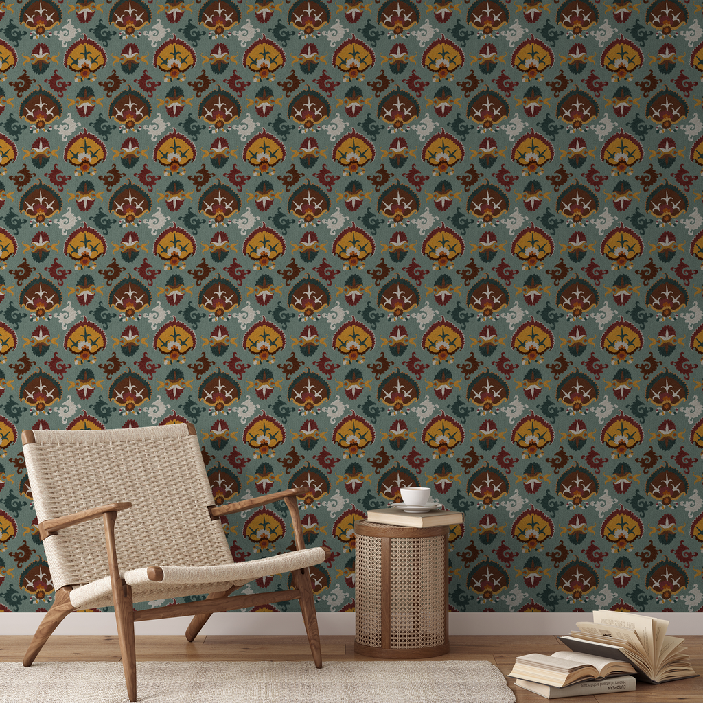 Elegant traditional damask-inspired pattern with ornate medallions in rich teal, burgundy, and gold with flowing organic shapes.