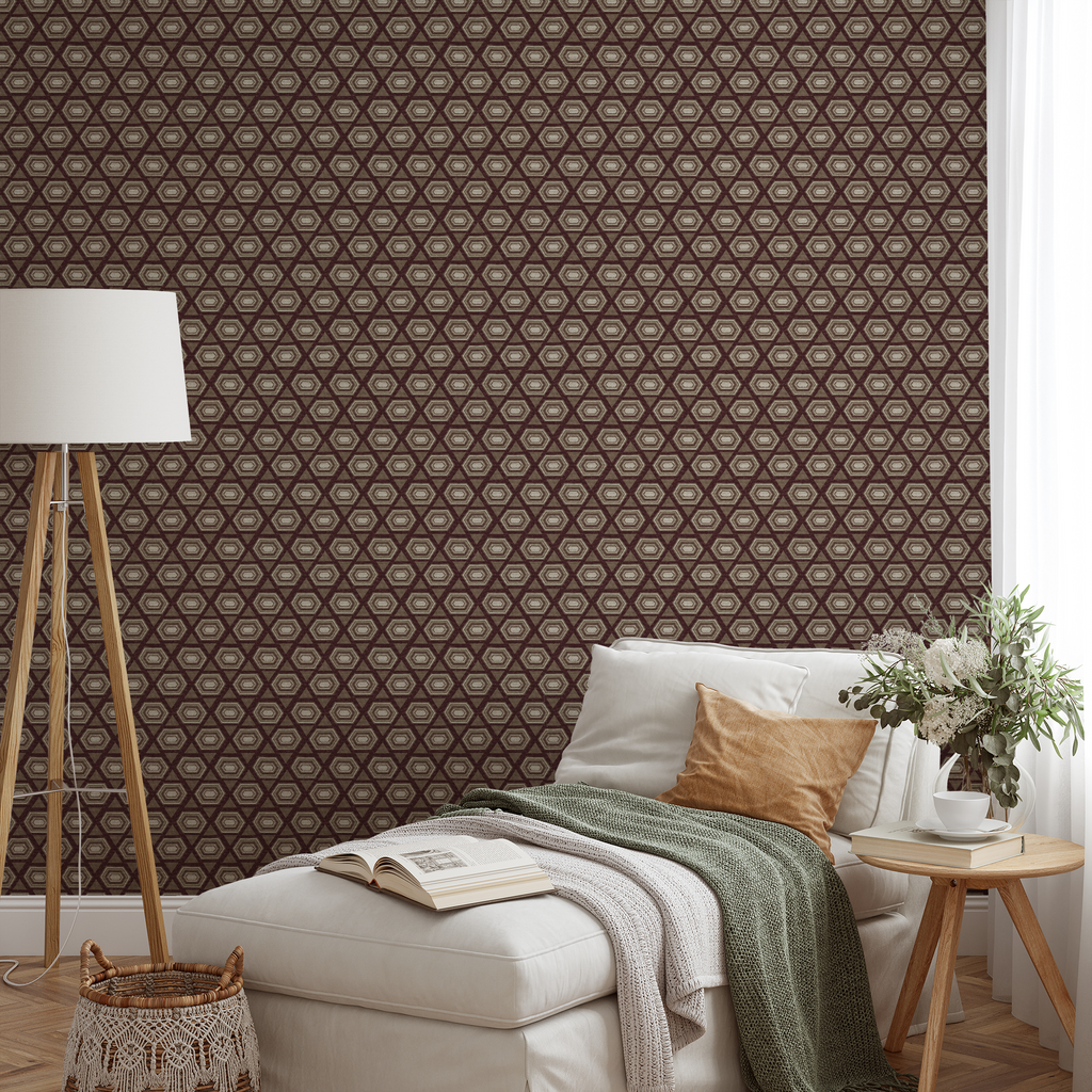 Stylish geometric pattern featuring concentric hexagons in burgundy and brown tones, perfect for contemporary touch of mid-century sophistication for any space.