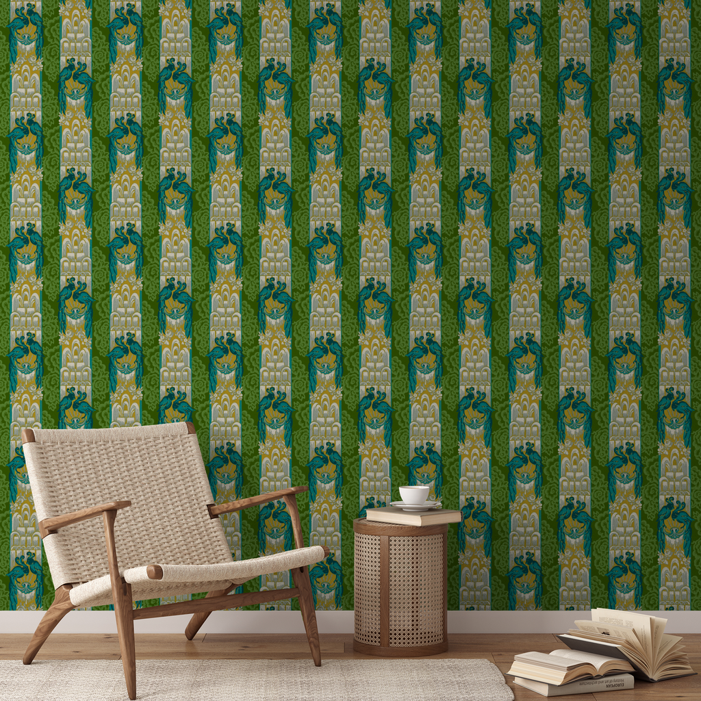 Elegant Art Deco wallpaper featuring turquoise peacocks and ornate gold fountains against a rich green background, perfect for creating a luxurious vintage atmosphere in home decor.