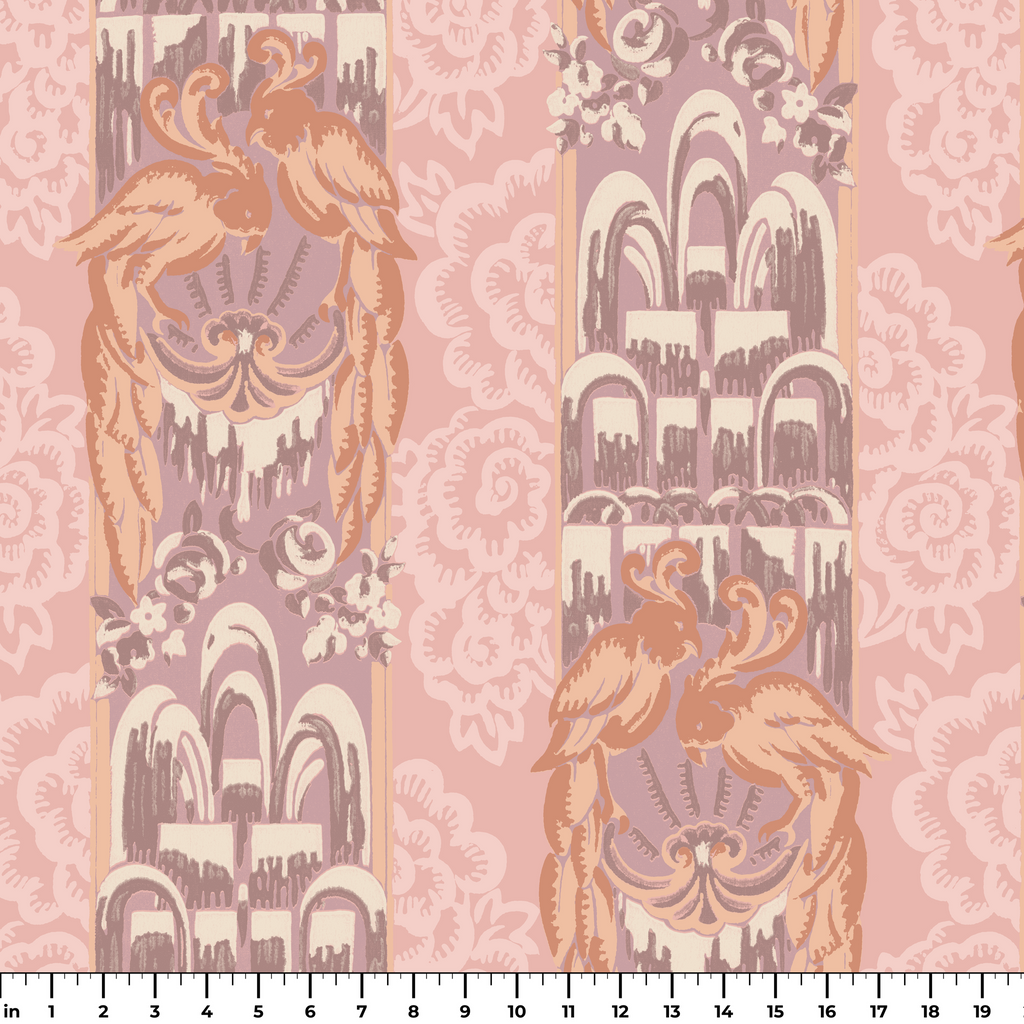 Elegant vintage pattern featuring Art Deco fountains and peacock motifs in coral and soft lavender tones on a soft pink background, creating a sophisticated heritage aesthetic.