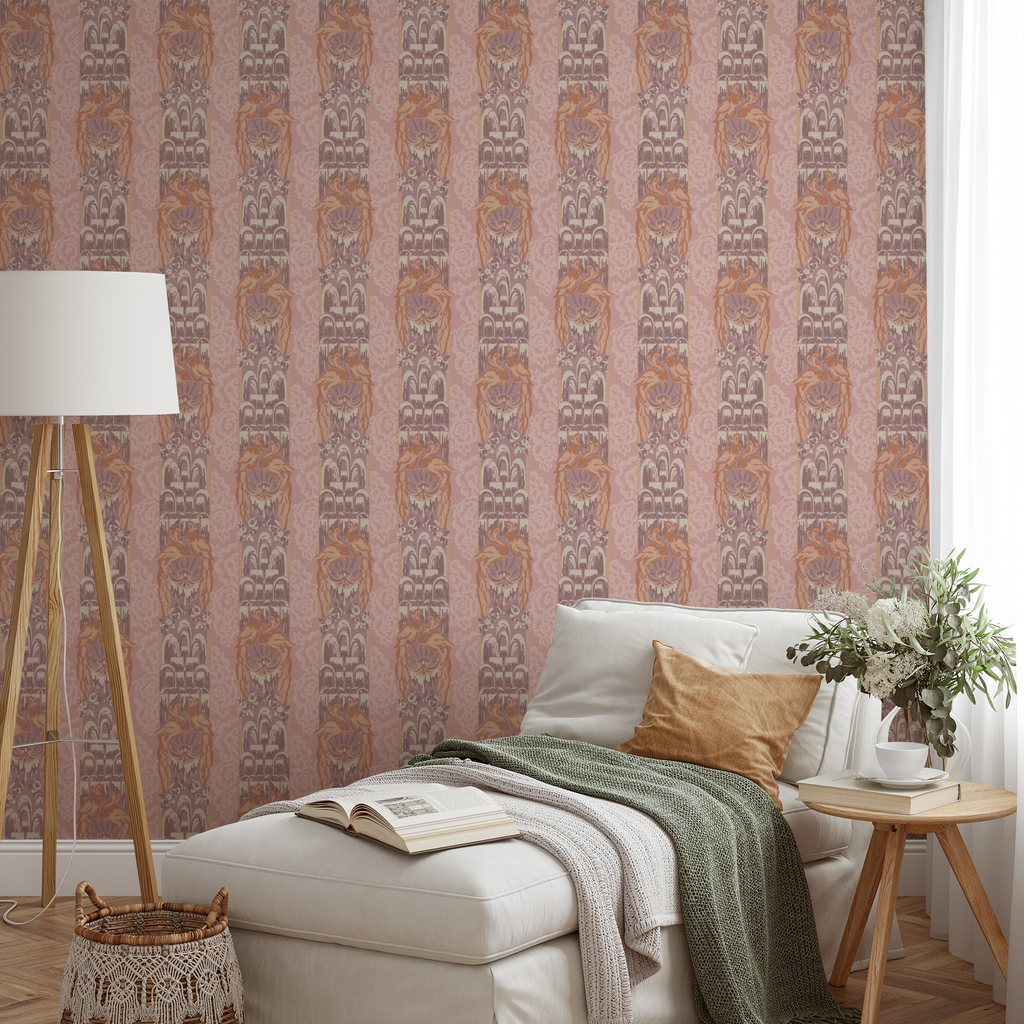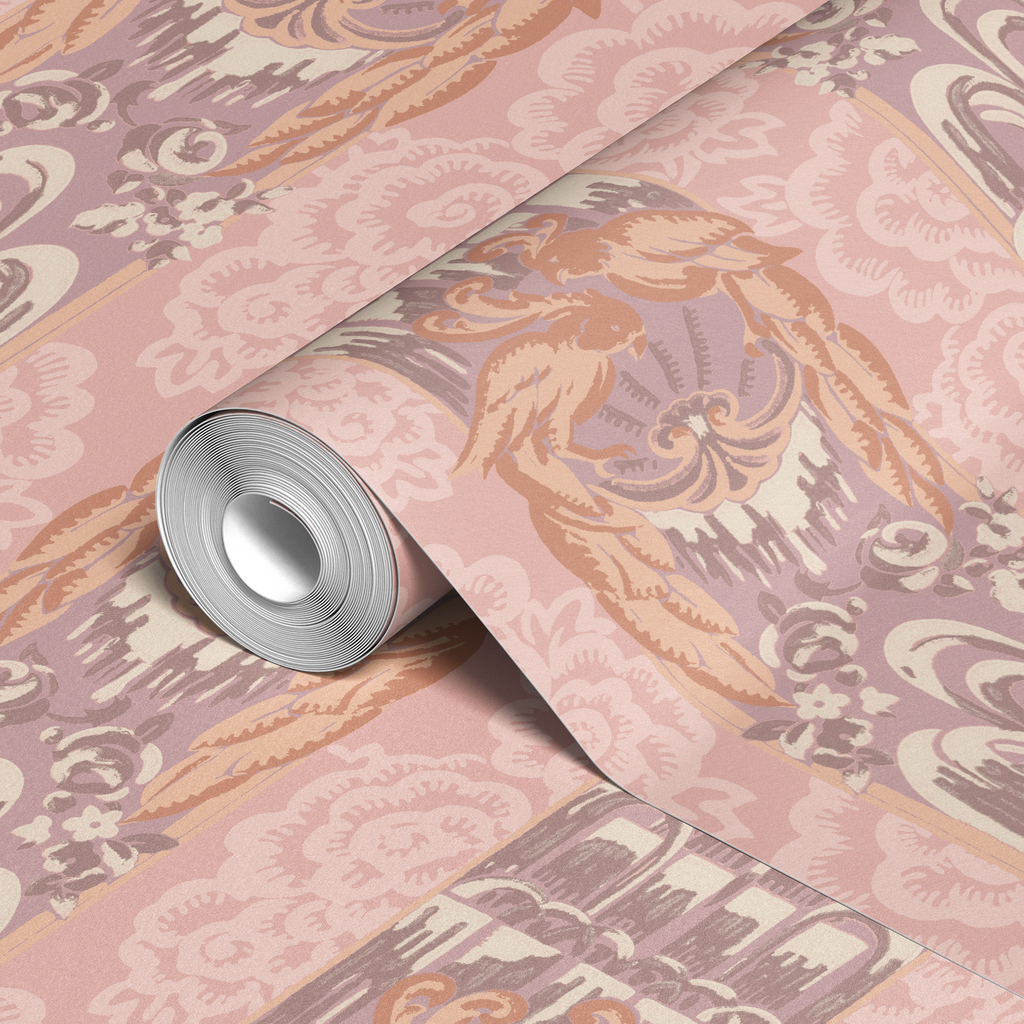 Elegant flamingo motif wallpaper design in soft blush and mauve tones, featuring graceful birds with Art Deco influences and vintage damask patterns.