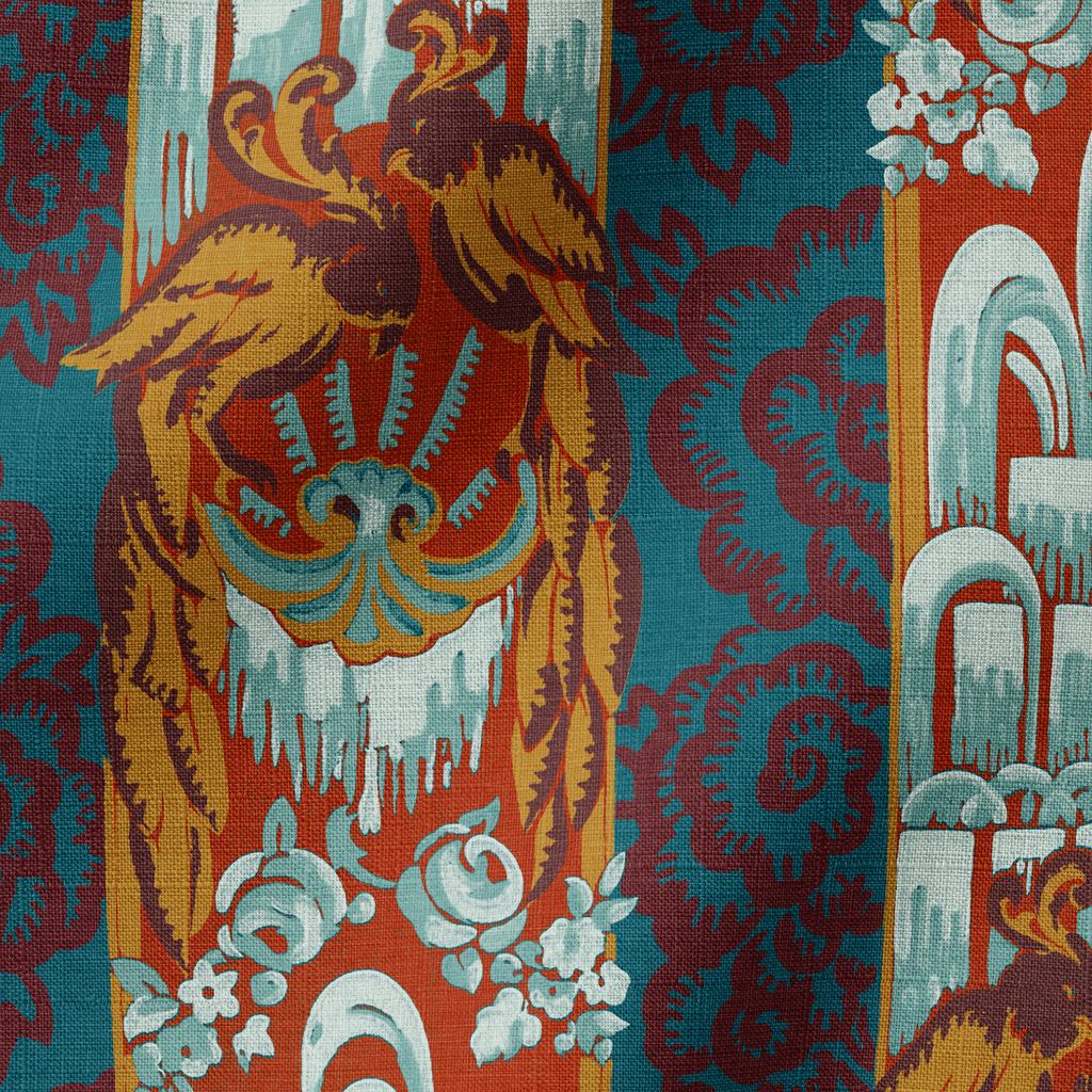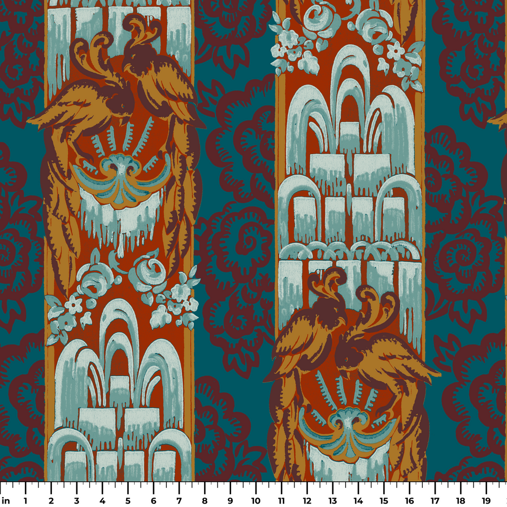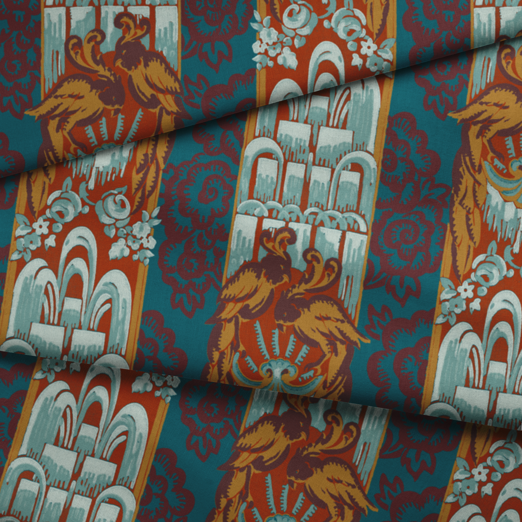 Elegant vintage pattern featuring Art Deco fountains and peacock motifs in teal and orange tones on a deep teal background, creating a sophisticated heritage aesthetic.