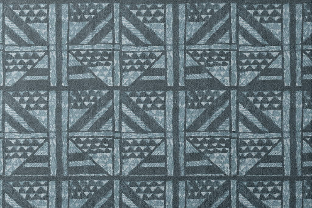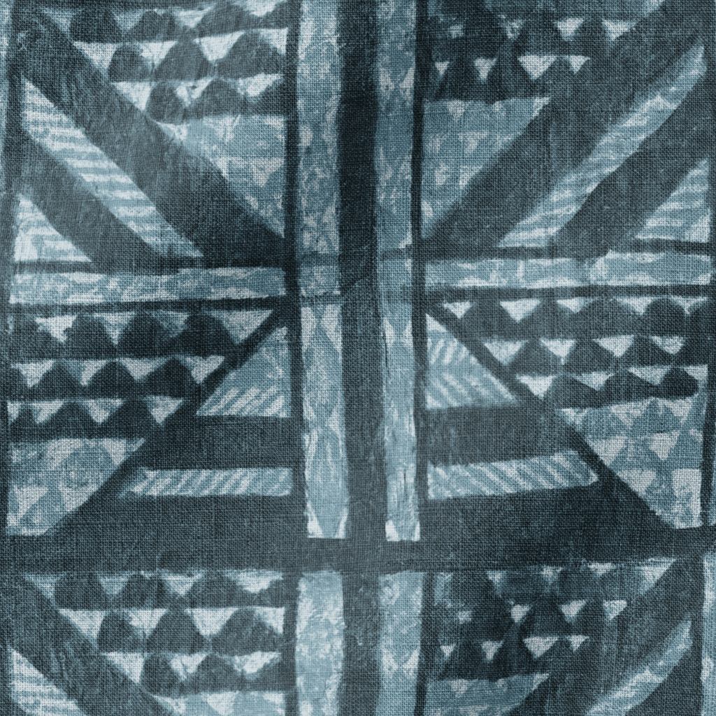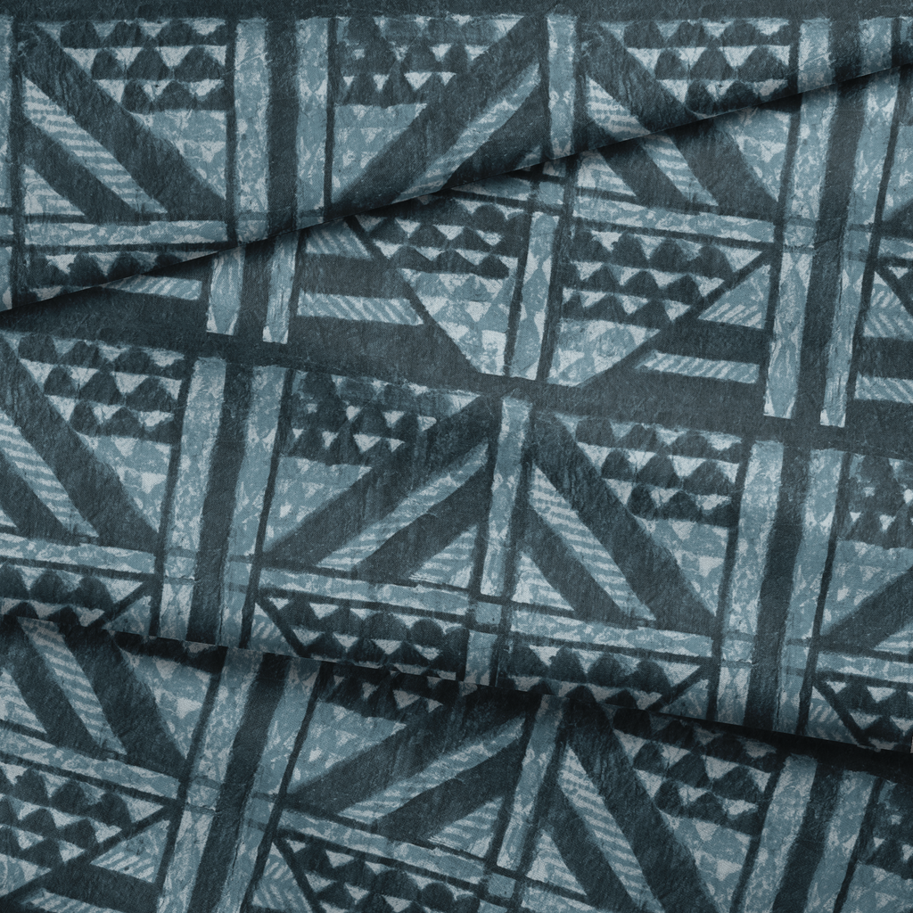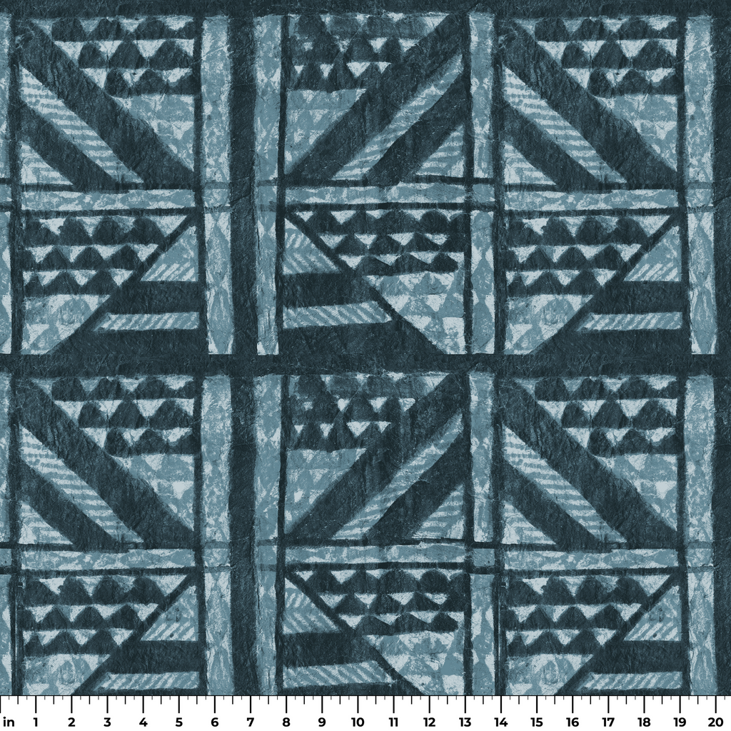 Dark and light blue geometric pattern featuring triangles, lines and traditional motifs in a symmetrical design. Perfect for a heritage-inspired space with a classic, sophisticated aesthetic.