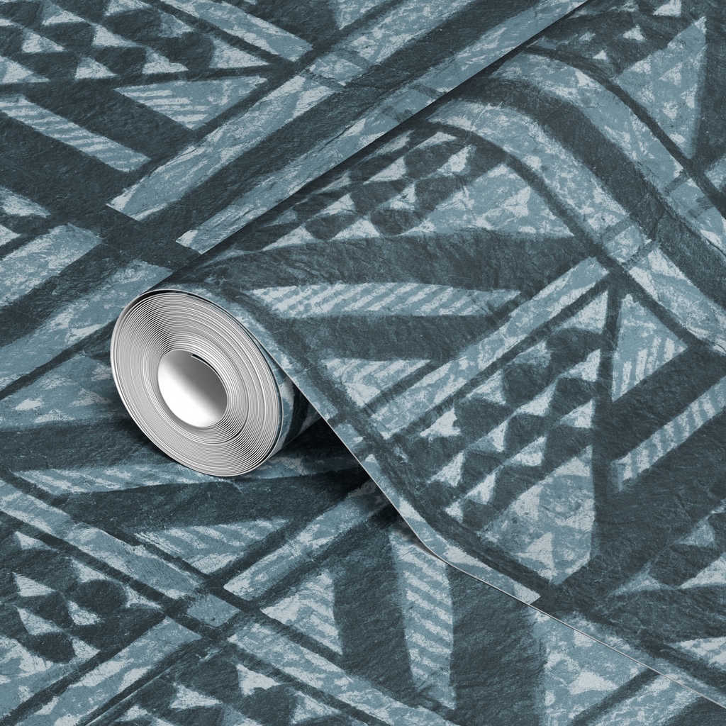 Dark and light blue geometric pattern featuring triangles, lines and traditional motifs in a symmetrical design. Perfect for a heritage-inspired space with a classic, sophisticated aesthetic.