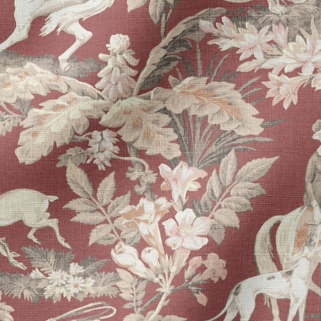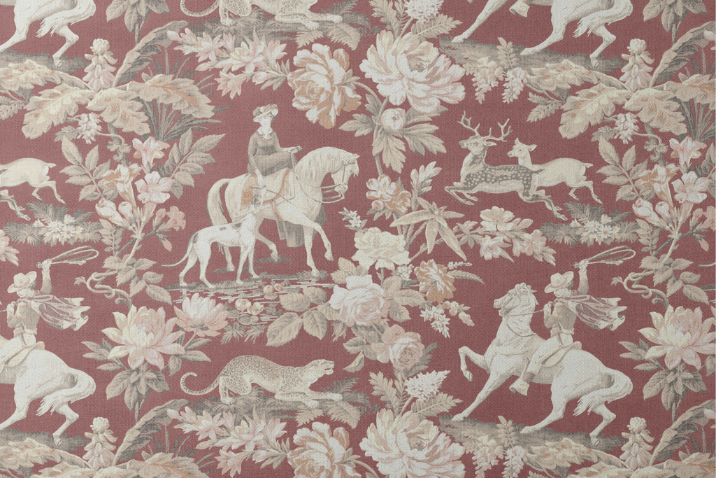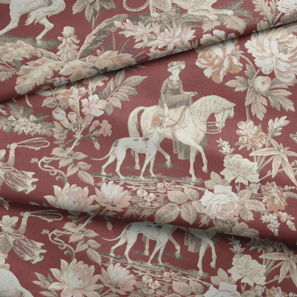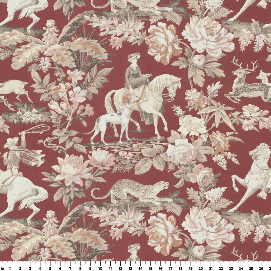 This elegant heritage toile pattern features equestrian scenes in a sophisticated burgundy and cream colorway, perfect for a traditional feel to your space.