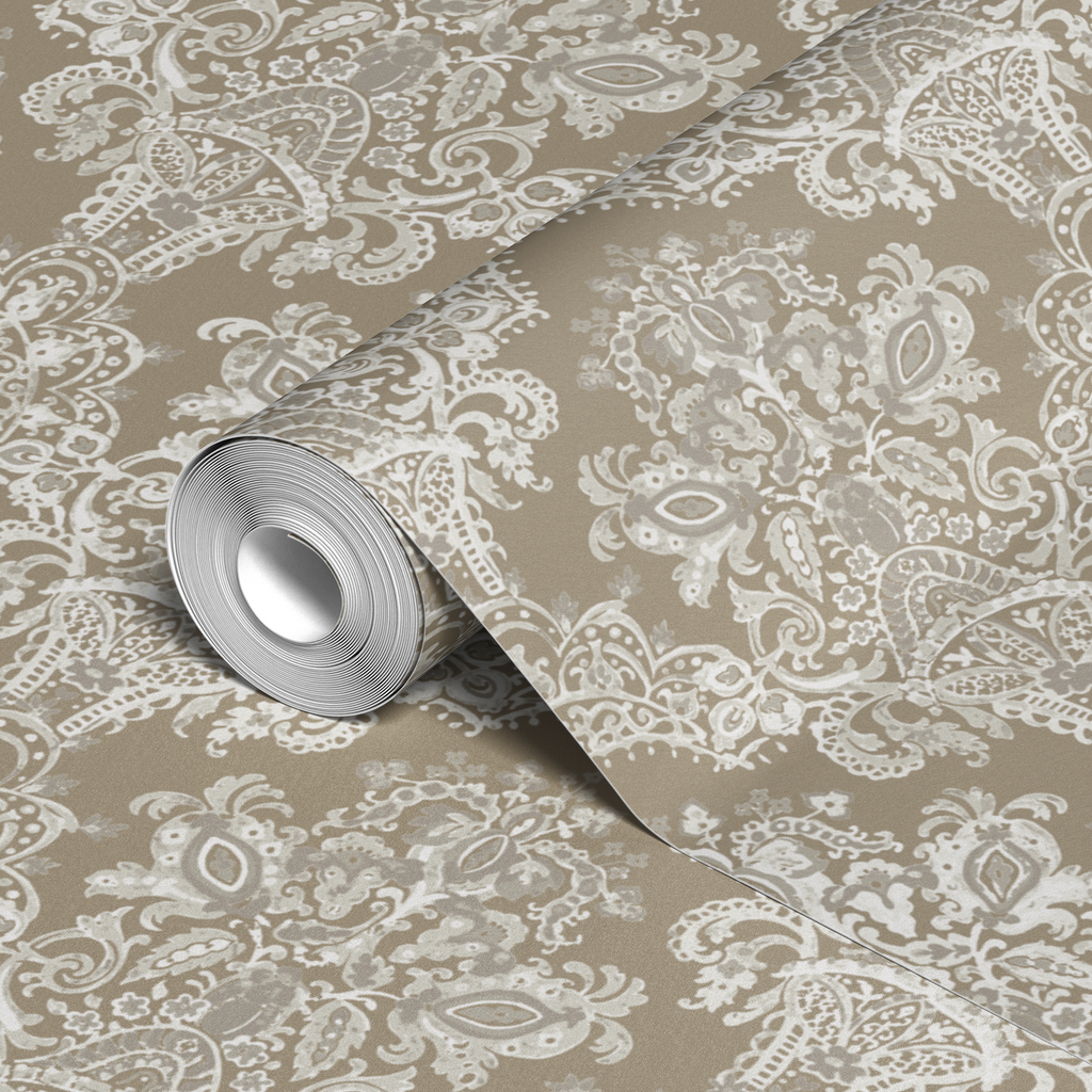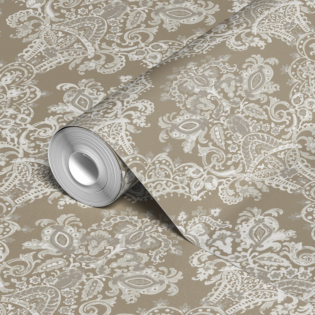 Rich damask pattern in luxurious brown tones, featuring elegant floral medallions and intricate scrollwork in a traditional heritage style, a unique addition to any space.