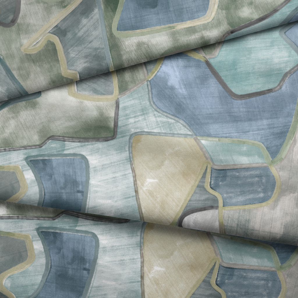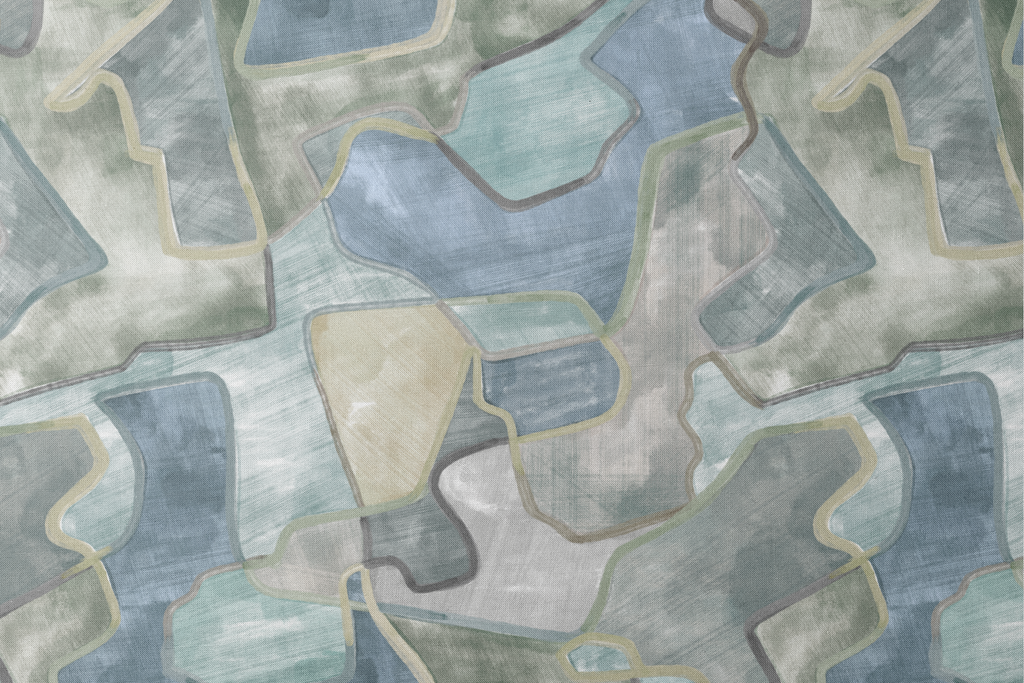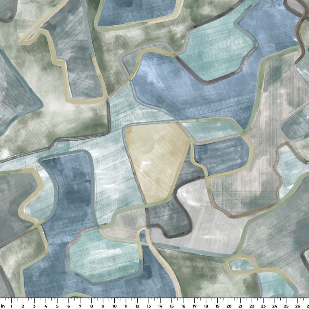 Soft abstract geometric shapes in muted blue, green, and neutral tones create a contemporary pattern with organic flowing lines reminiscent of a modern watercolor landscape.