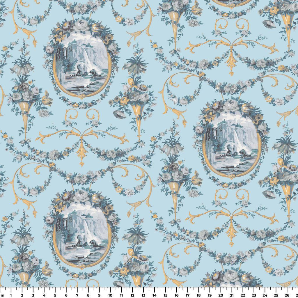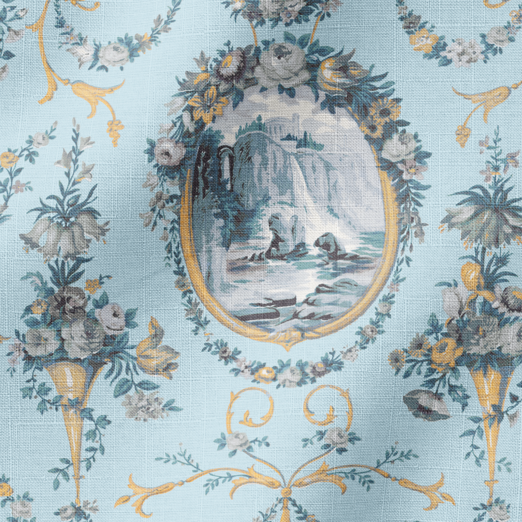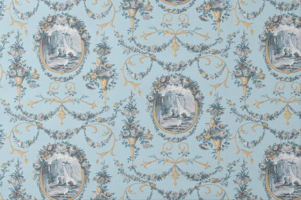 A classic French toile design featuring scenic countryside vignettes framed by delicate floral garlands. This timeless pattern exudes romantic charm with its refined detailing and vintage decorative elegance.