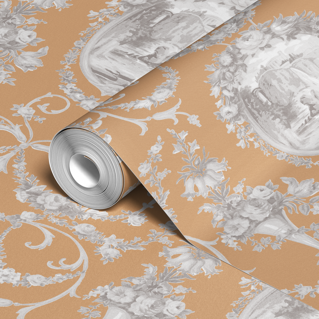 Elegant peach and white toile wallpaper featuring scenic medallions and ornate floral scrollwork in a traditional French style. Perfect for classic heritage interiors with a romantic touch.