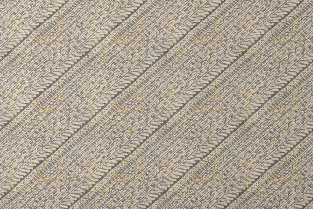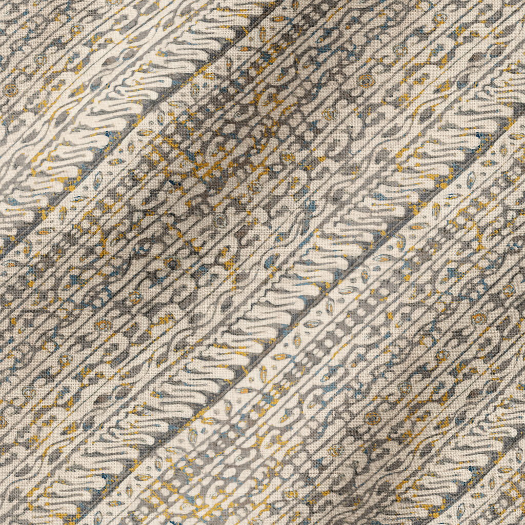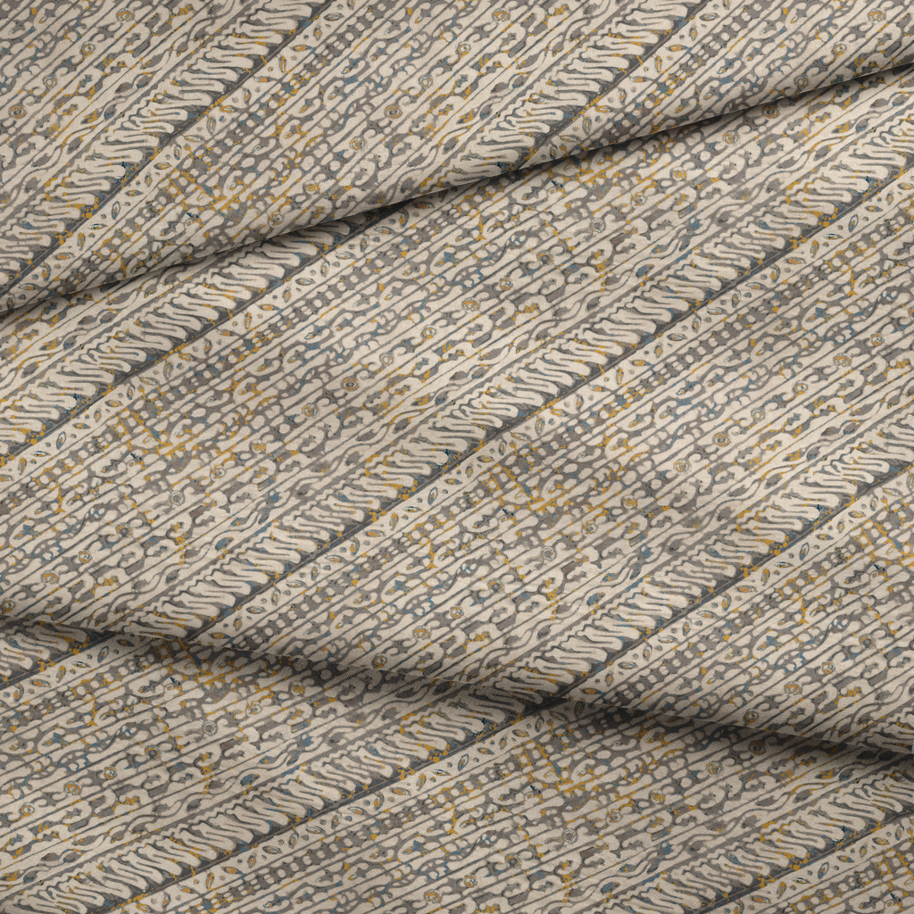 Traditional batik pattern with elegant diagonal layout featuring flowing curved lines and delicate dots in neutral beige, gold, and gray tones. Perfect for heritage-inspired home decor.
