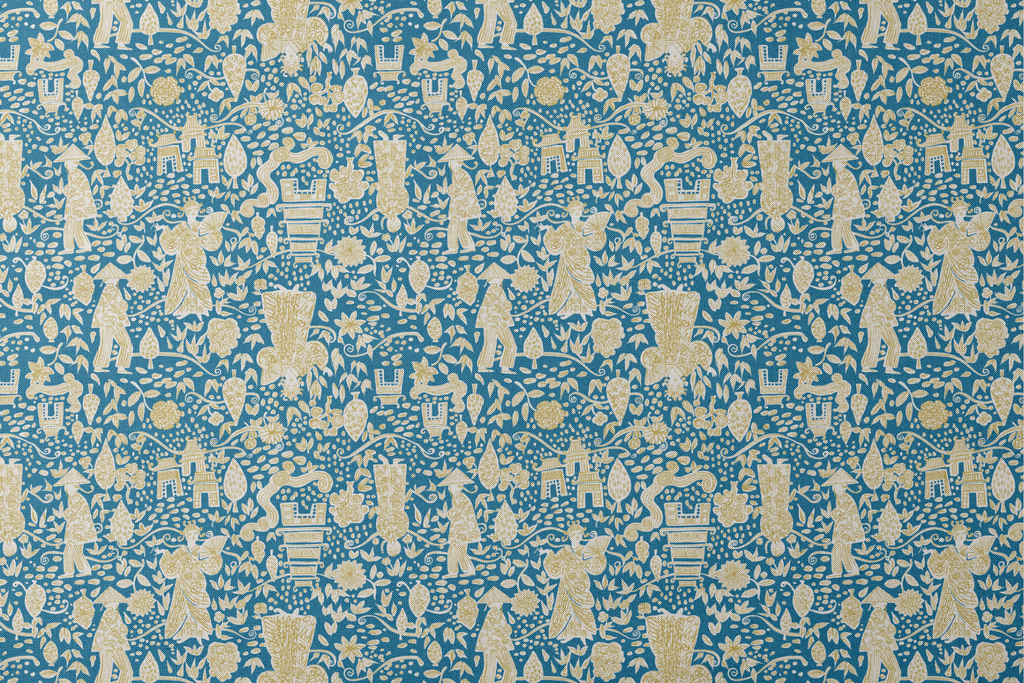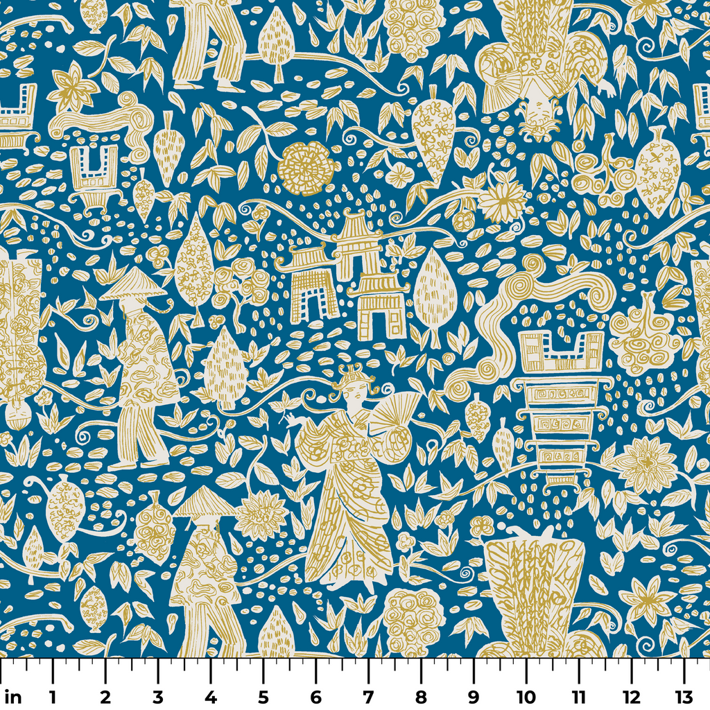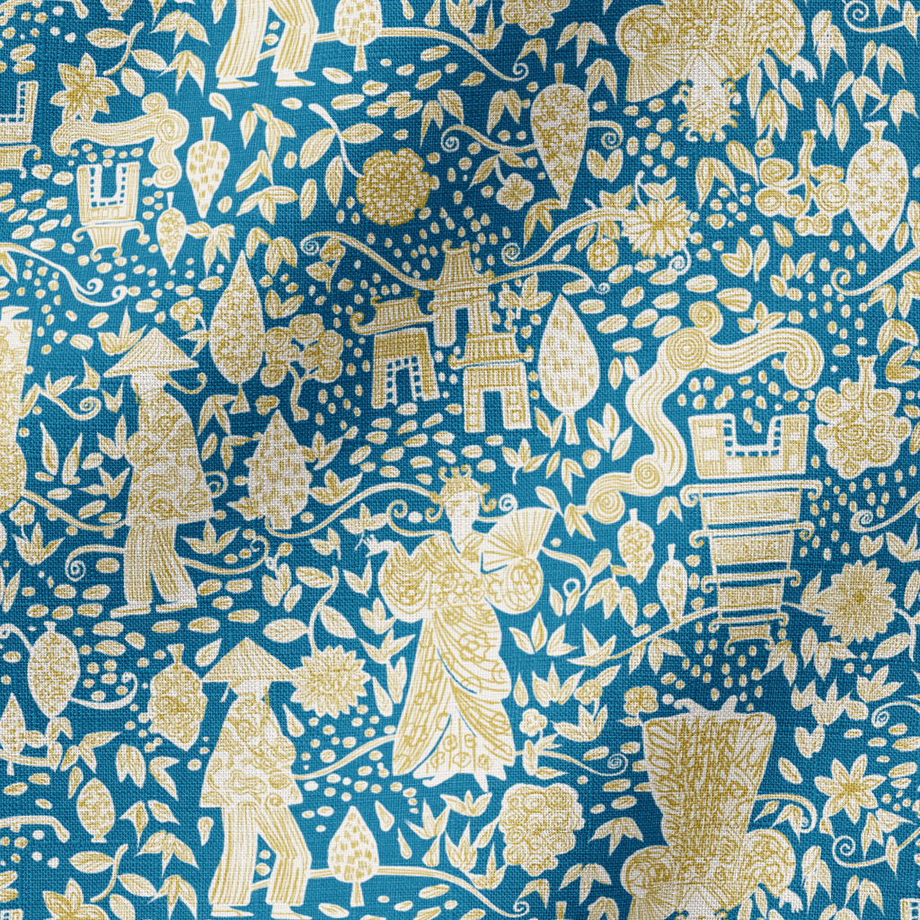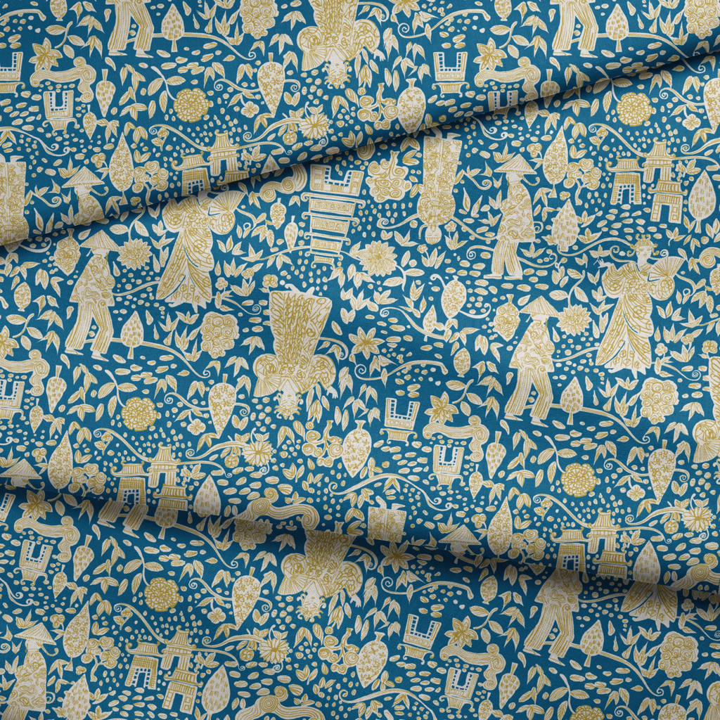 Beautiful Asian-inspired pattern with ornate figures and pagodas against a rich blue background, featuring delicate floral motifs and intricate botanical details, perfect for a cultural touch to any room.