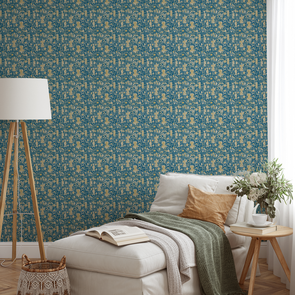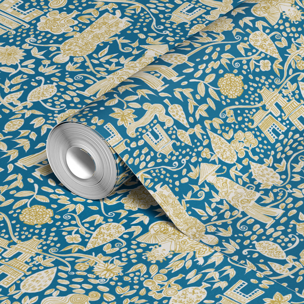 Beautiful Asian-inspired pattern with ornate figures and pagodas against a rich blue background, featuring delicate floral motifs and intricate botanical details, perfect for a cultural touch to any room.