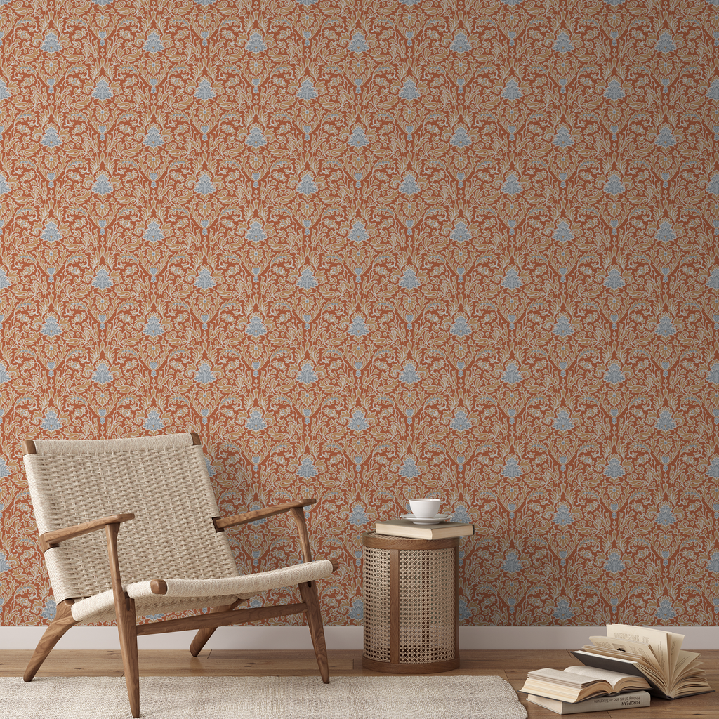 Elegant terracotta and blue damask pattern featuring ornate floral motifs in a traditional heritage style. Perfect for home decor projects with its timeless Mediterranean appeal.