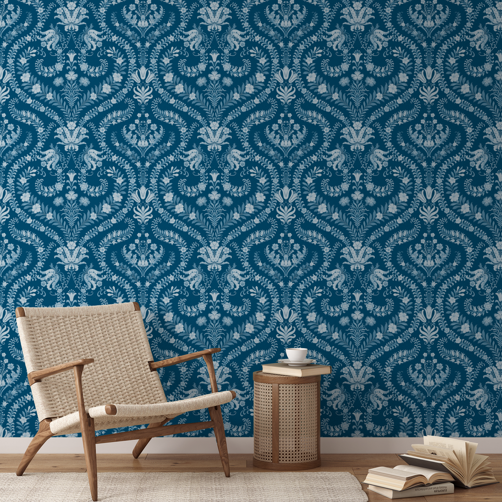 Elegant blue damask pattern with intricate floral motifs and ornamental swirls, perfect for traditional home decor projects that require a timeless, sophisticated design element.