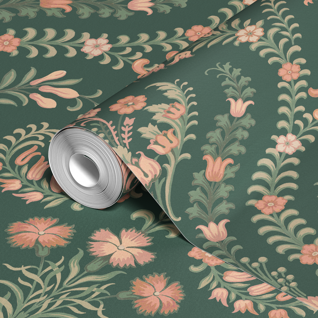 Elegant vintage damask pattern featuring coral floral motifs on a deep forest green background, creating a timeless heritage design perfect for home decor.