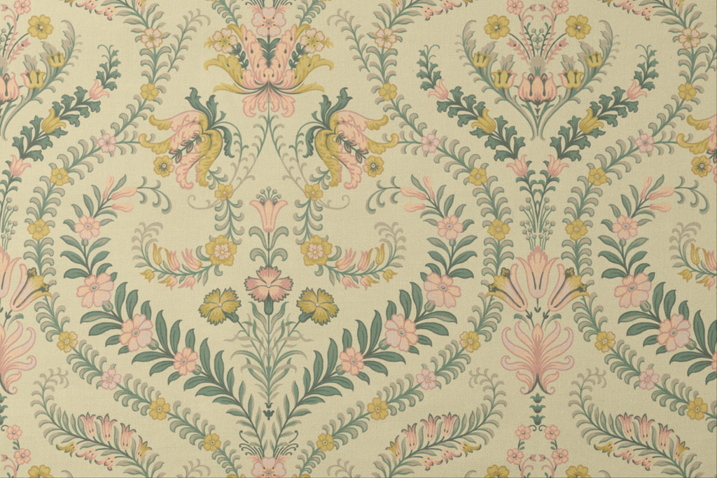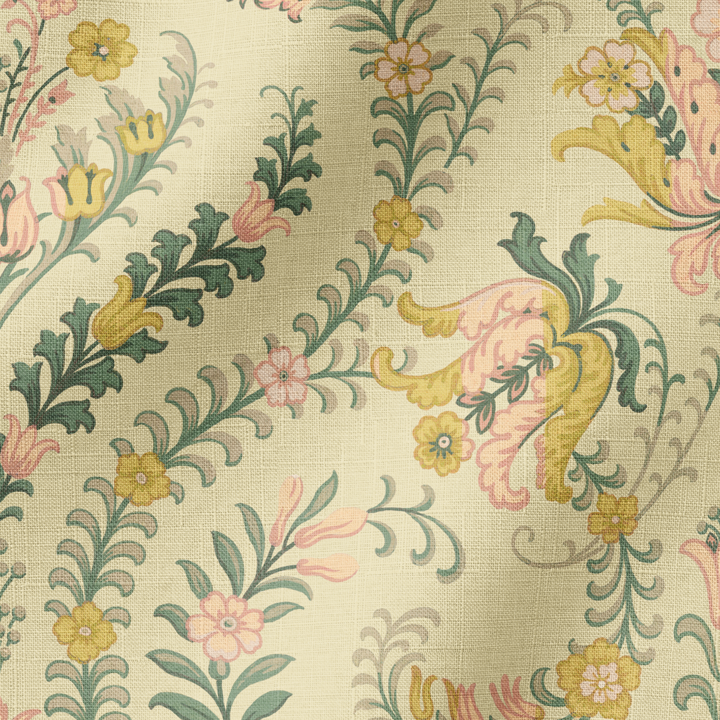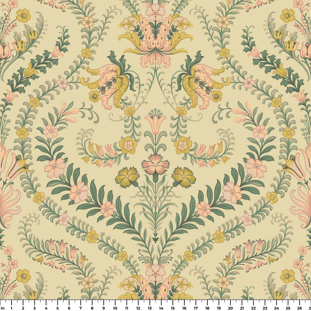 Elegant soft yellow damask pattern with symmetrical floral motifs and leafy scrollwork creates a timeless, traditional design.