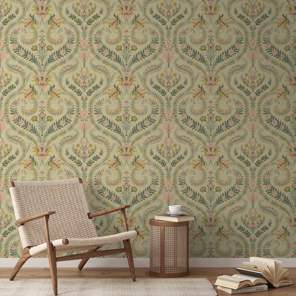 Elegant vintage botanical damask pattern featuring delicate pink and yellow florals with sage green foliage on a soft cream background, perfect for heritage-inspired home decor.