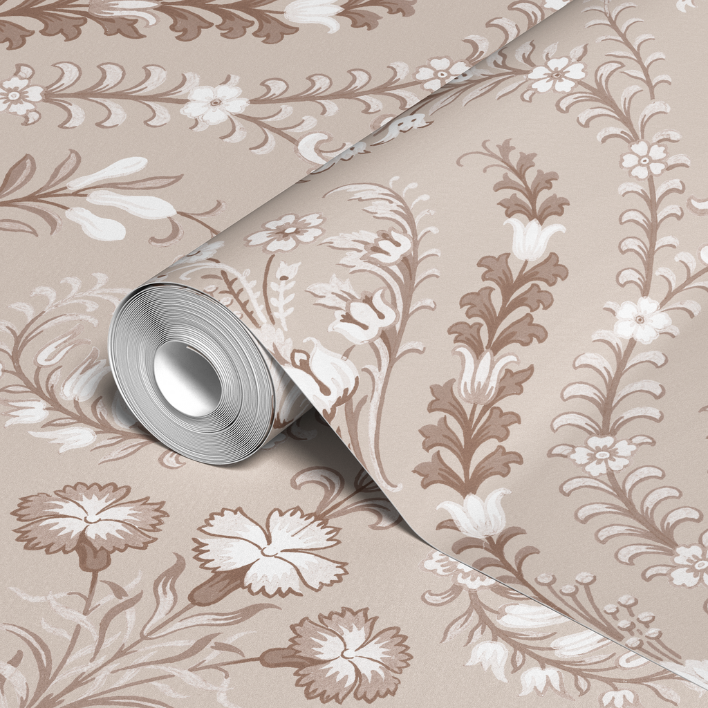 Elegant damask floral pattern in soft neutral tones with traditional symmetrical design. Perfect for heritage-inspired home decor with its timeless botanical motifs and sophisticated beige color palette.