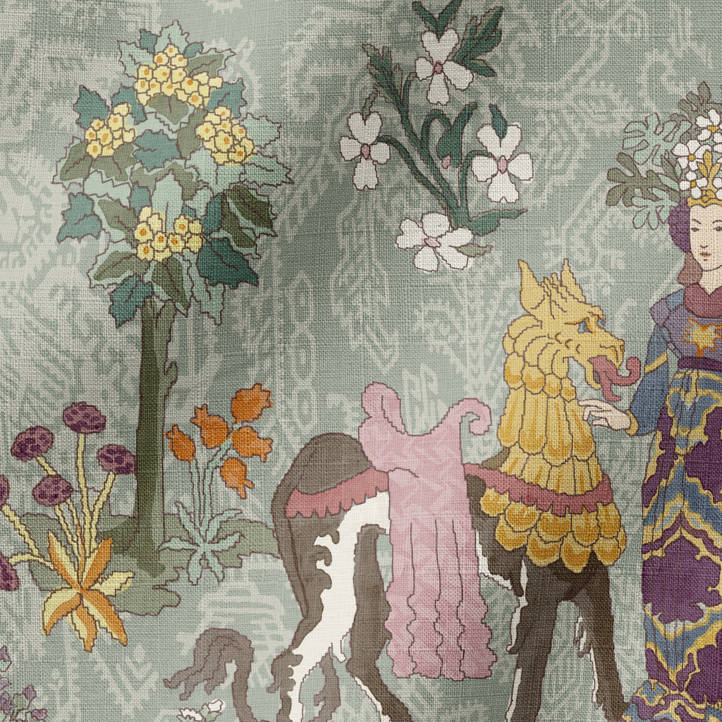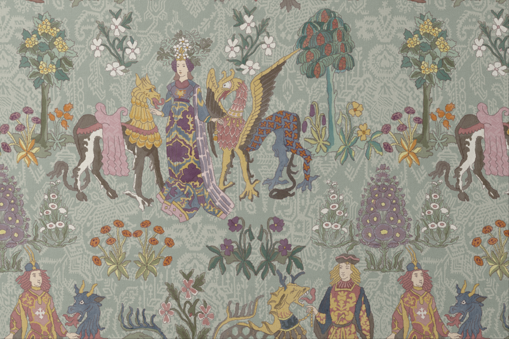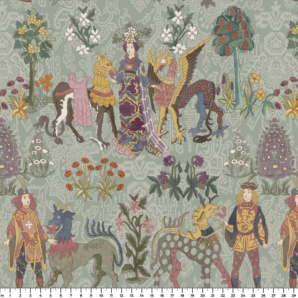 This medieval design features ornate mythical scenes with figures in elaborate robes surrounded by stylized animals, flowering trees, and decorative elements on a blue-gray background.