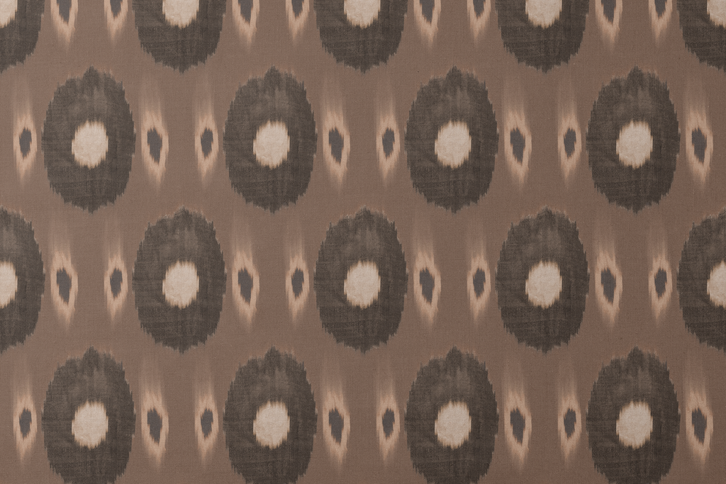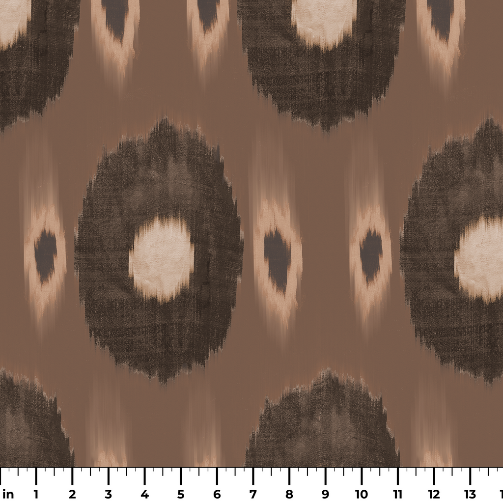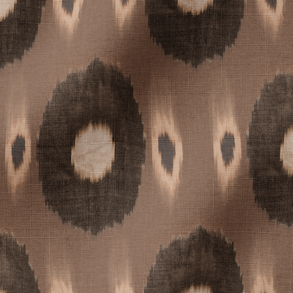 Earthy brown ikat pattern with abstract circular medallions creates a bohemian feel, perfect for contemporary home decor with its traditional, global-inspired pattern.