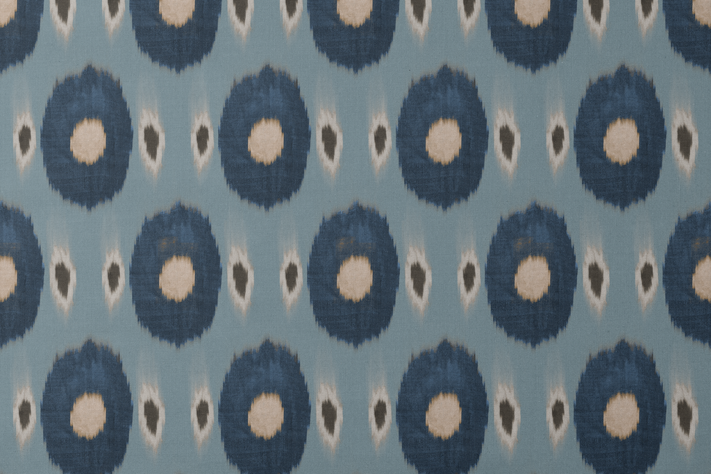Beautiful ikat-inspired pattern in soothing blue tones with circular medallions. Contemporary yet traditional design with blurred edges creates an elegant bohemian appeal for home decor.