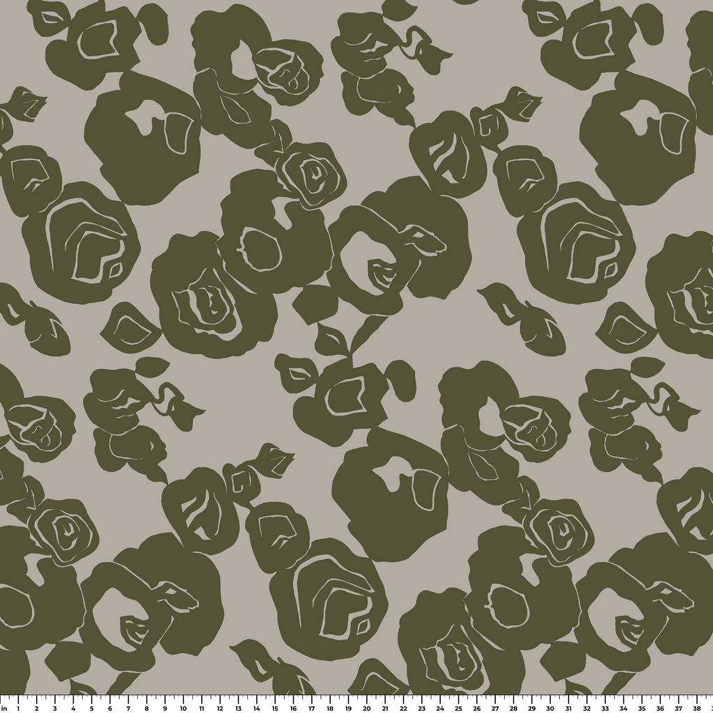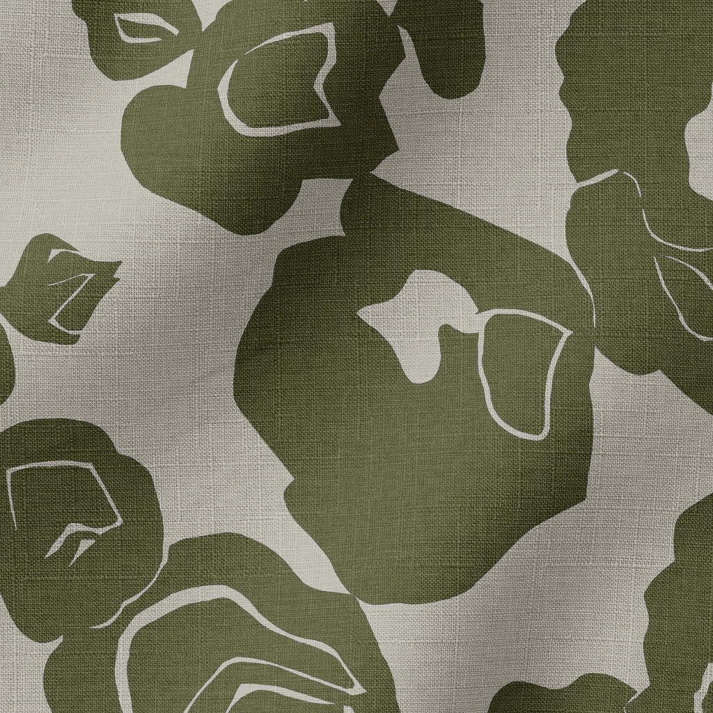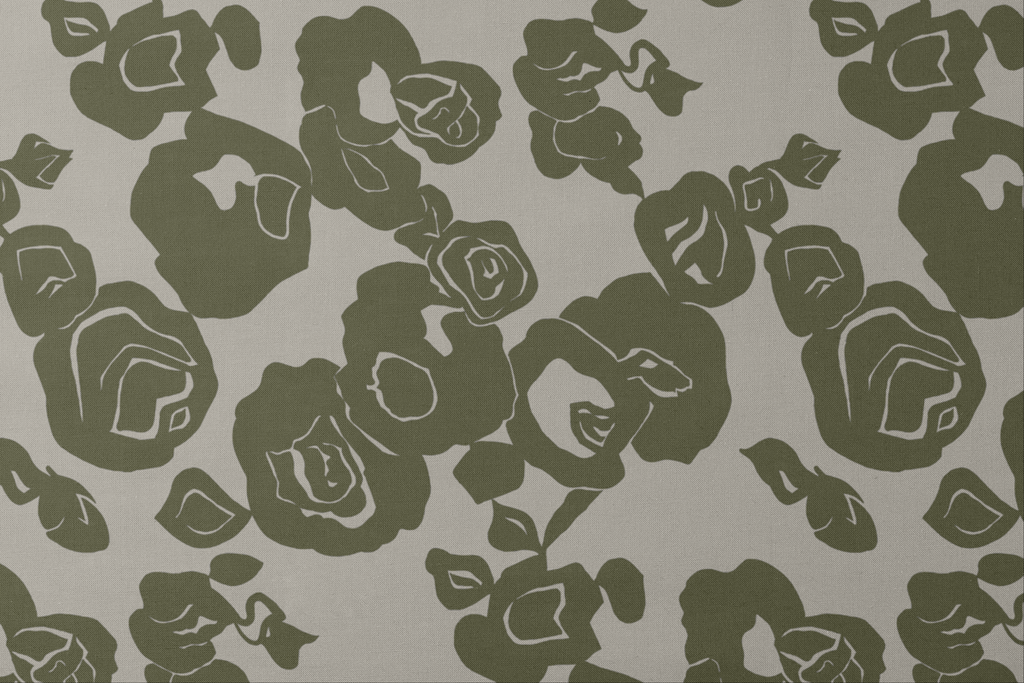 Elegant olive green floral pattern on light beige background, featuring abstract roses in a modern minimalist style perfect for contemporary home decor or fashion accessories.