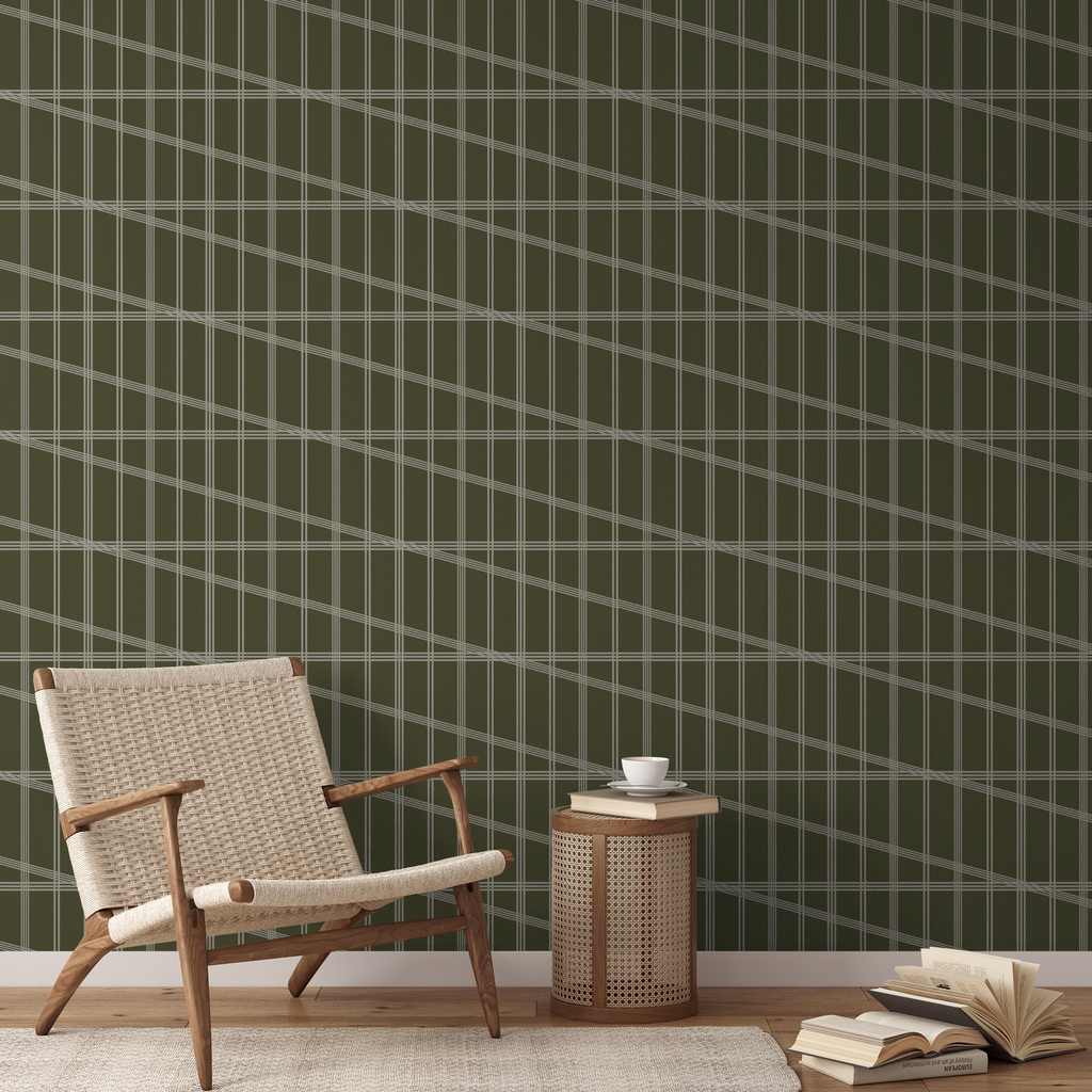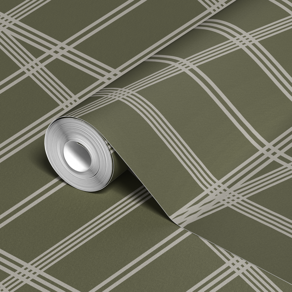 Elegante patrón geométrico de líneas entrelazadas en verde oliva y beige que crea un efecto de cuadrícula moderno y minimalista, perfecto para decoración contemporánea.