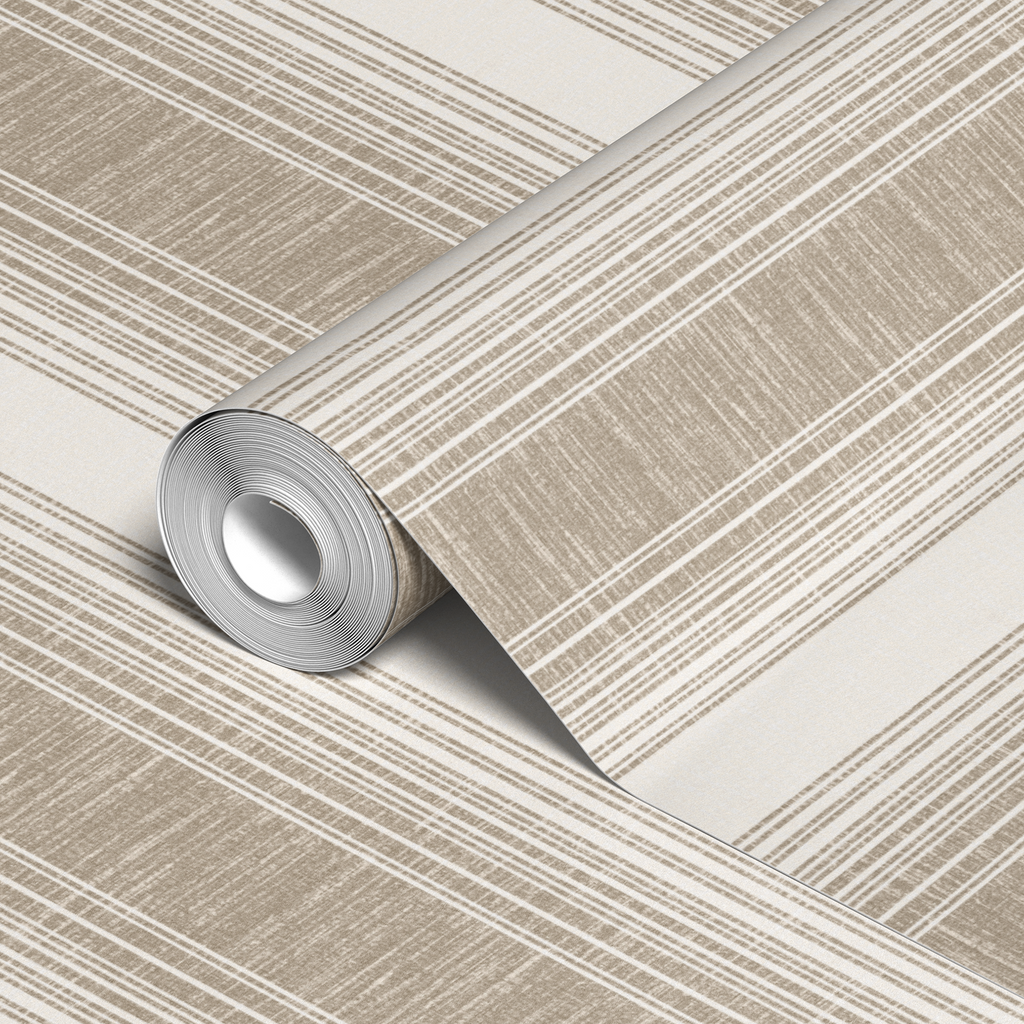 Sophisticated contemporary beige and white stripes create a modern, textured look with varying widths and subtle distressed effects