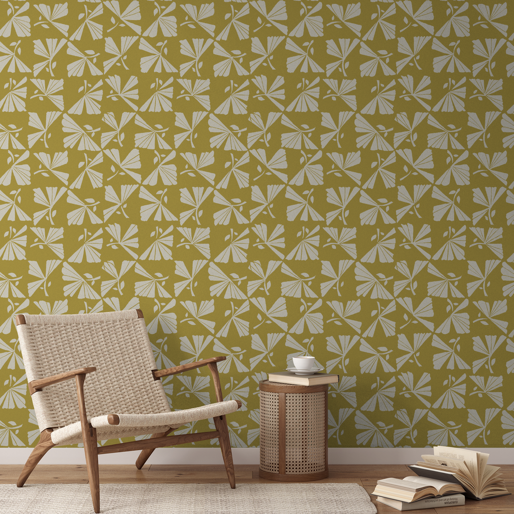 Striking fan-shaped motifs in mustard and cream create a contemporary yet retro pattern with mid-century modern flair, perfect for stylish home decor or statement apparel.