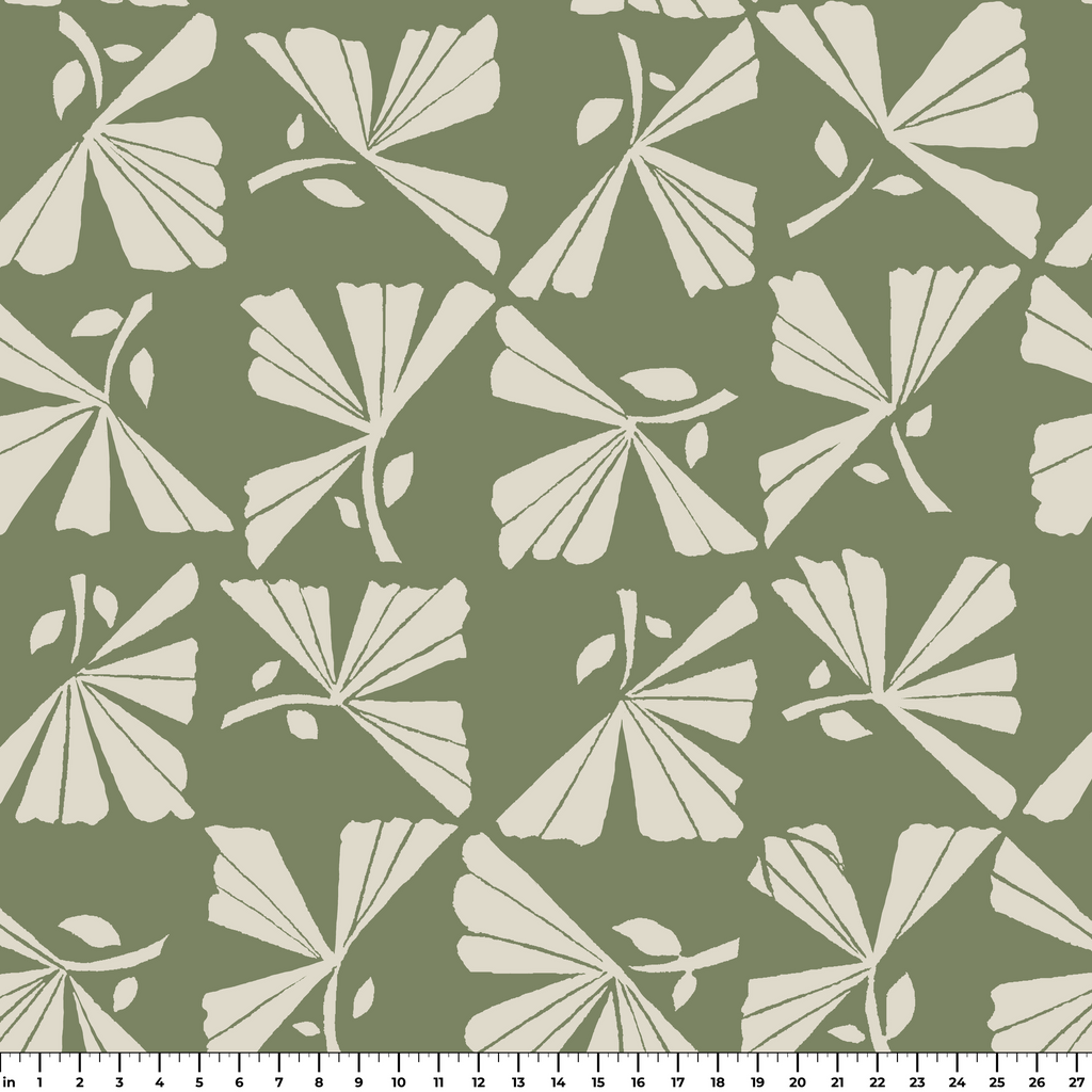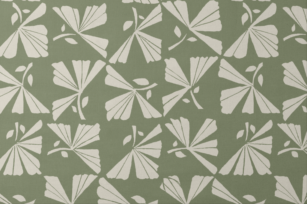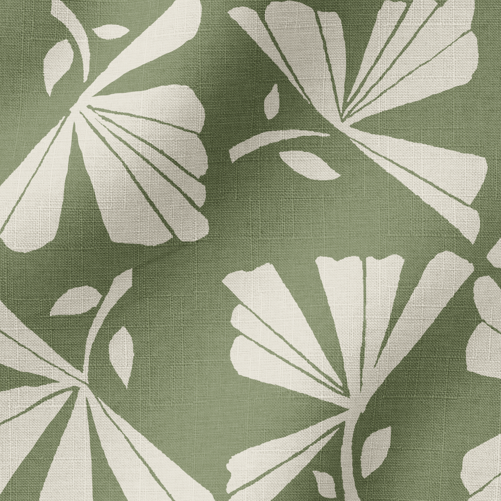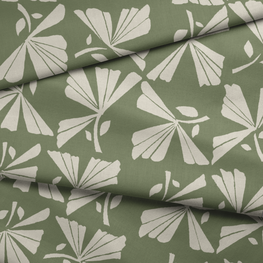 Elegant sage green and cream fan-shaped leaves create a sophisticated botanical motif with a vintage appeal, perfect for modern home decor or stylish apparel.