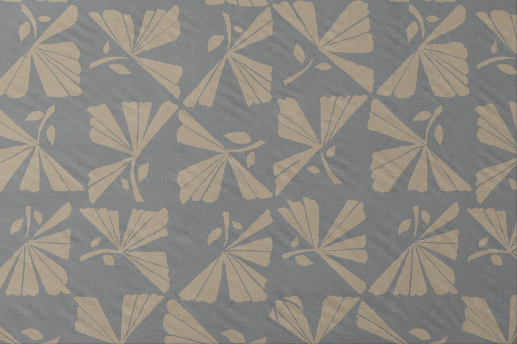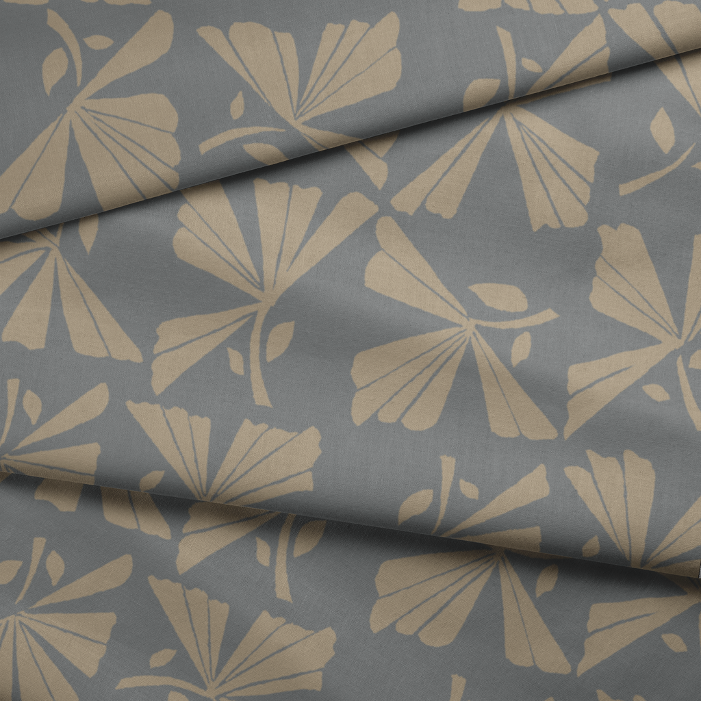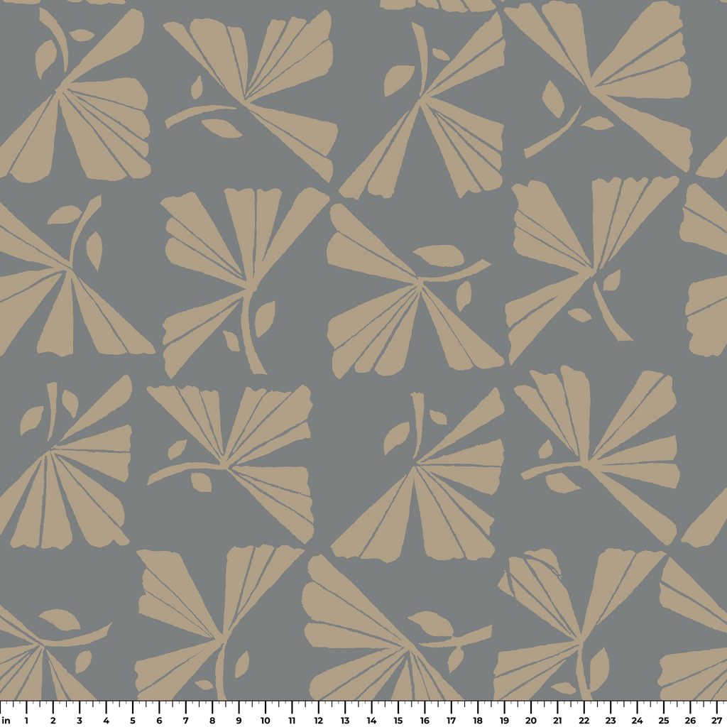Elegant fan-like motifs in neutral beige on a slate gray background create a sophisticated Art Deco-inspired pattern with geometric forms perfect for contemporary home décor.