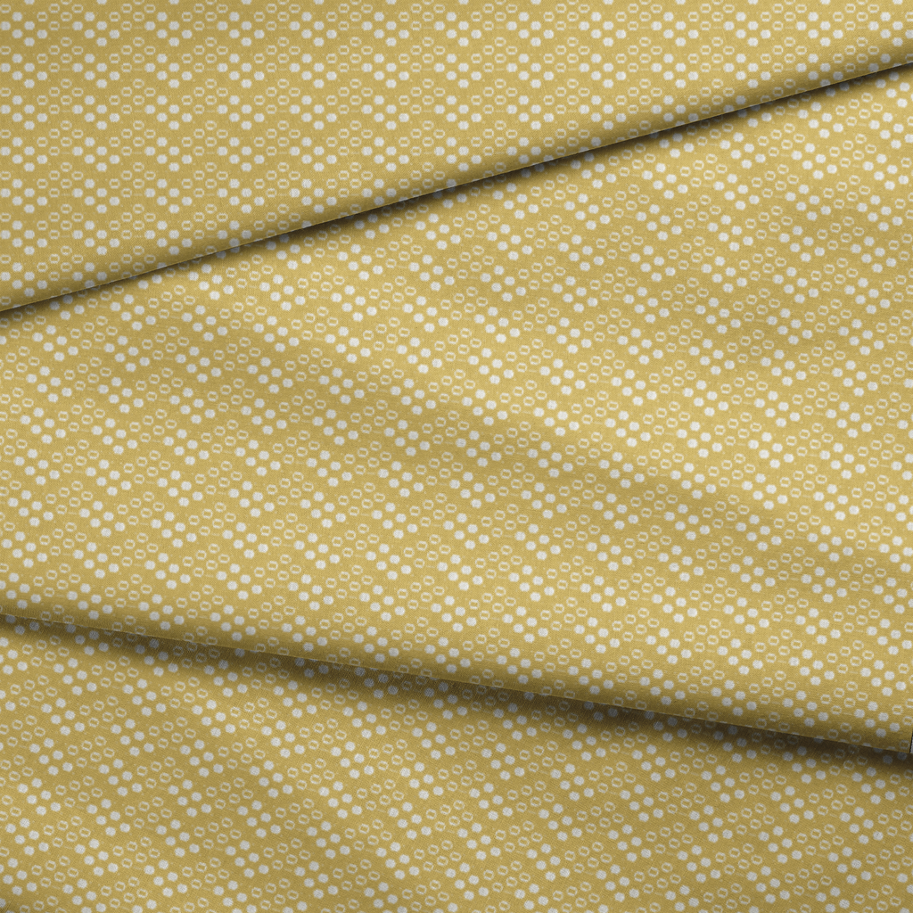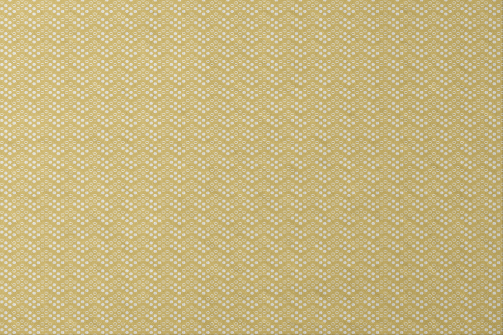 Textured mustard fabric featuring abstract geometric shapes in white, creating a modern yet retro pattern with organic forms. Perfect for contemporary home decor or upholstery projects.