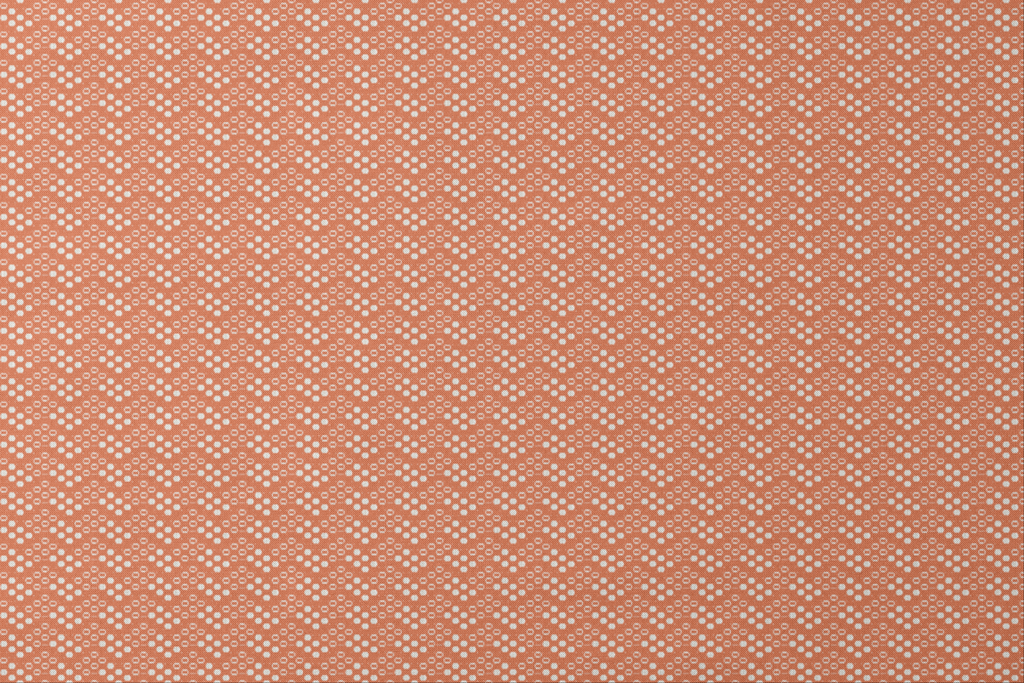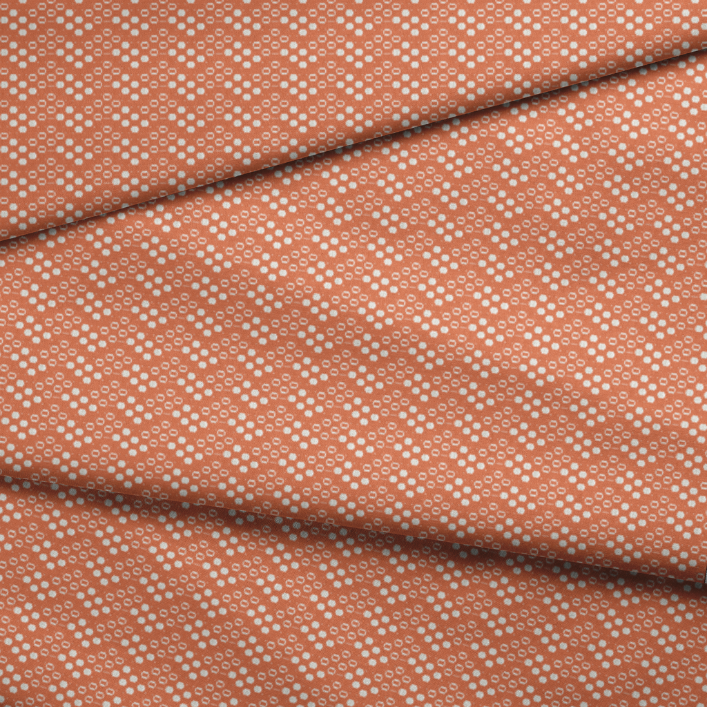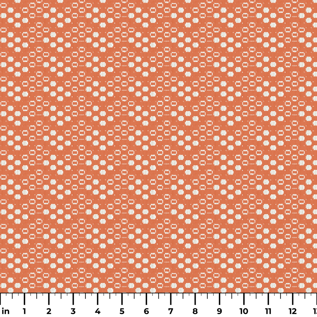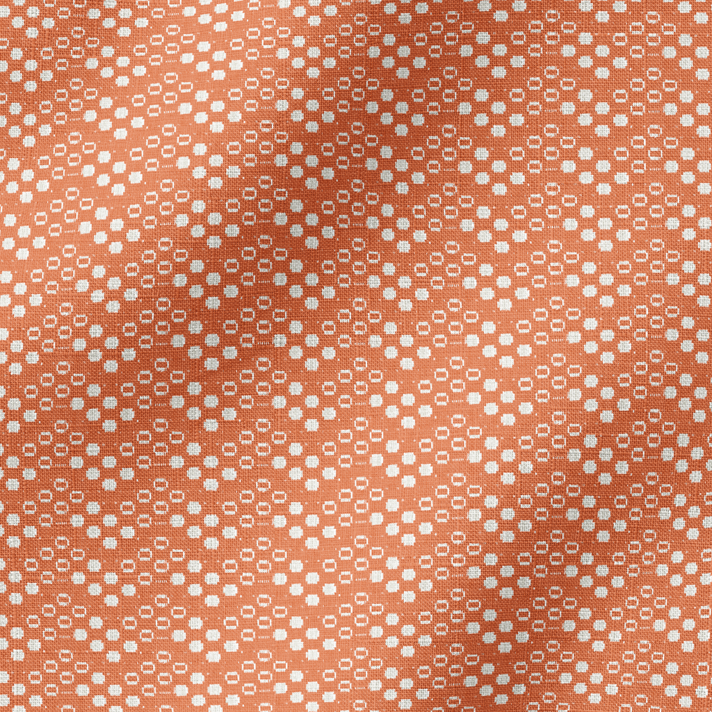 Retro terracotta fabric with geometric white rectangular and circular shapes in a medium-scale repeat pattern. Perfect for mid-century inspired home decor and upholstery projects.