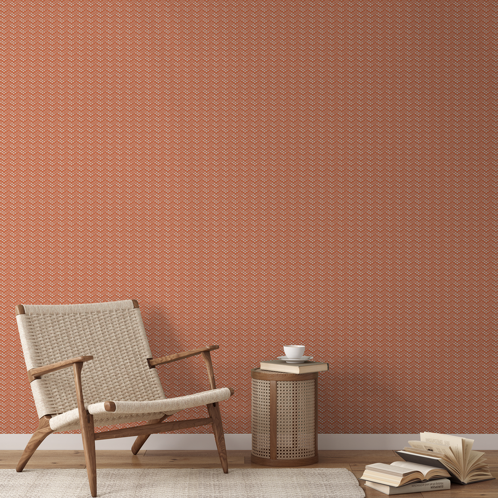 Retro terracotta fabric with geometric white rectangular and circular shapes in a medium-scale repeat pattern. Perfect for mid-century inspired home decor and upholstery projects.