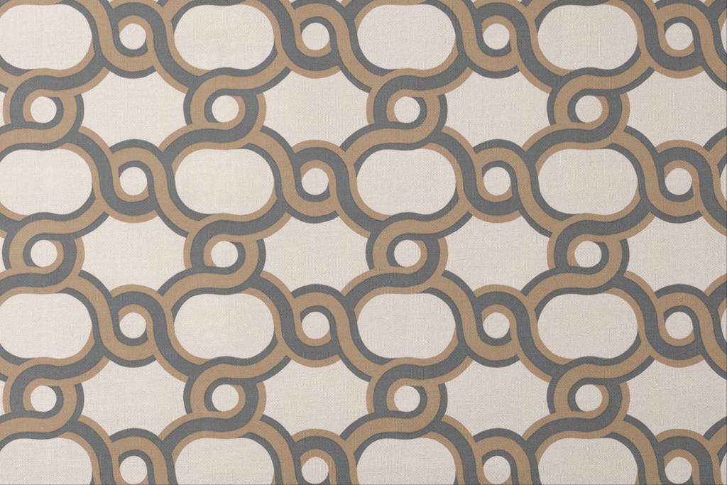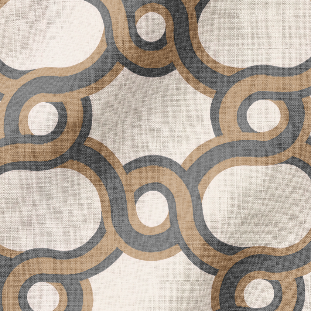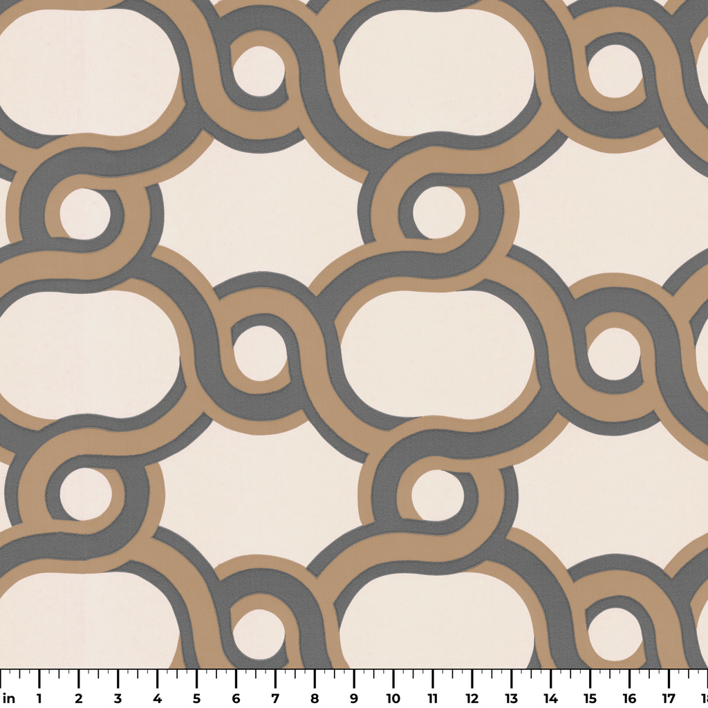 This sophisticated geometric pattern features interconnected curves and circles in elegant gray and tan on a neutral cream background, creating a timeless mid-century modern aesthetic.