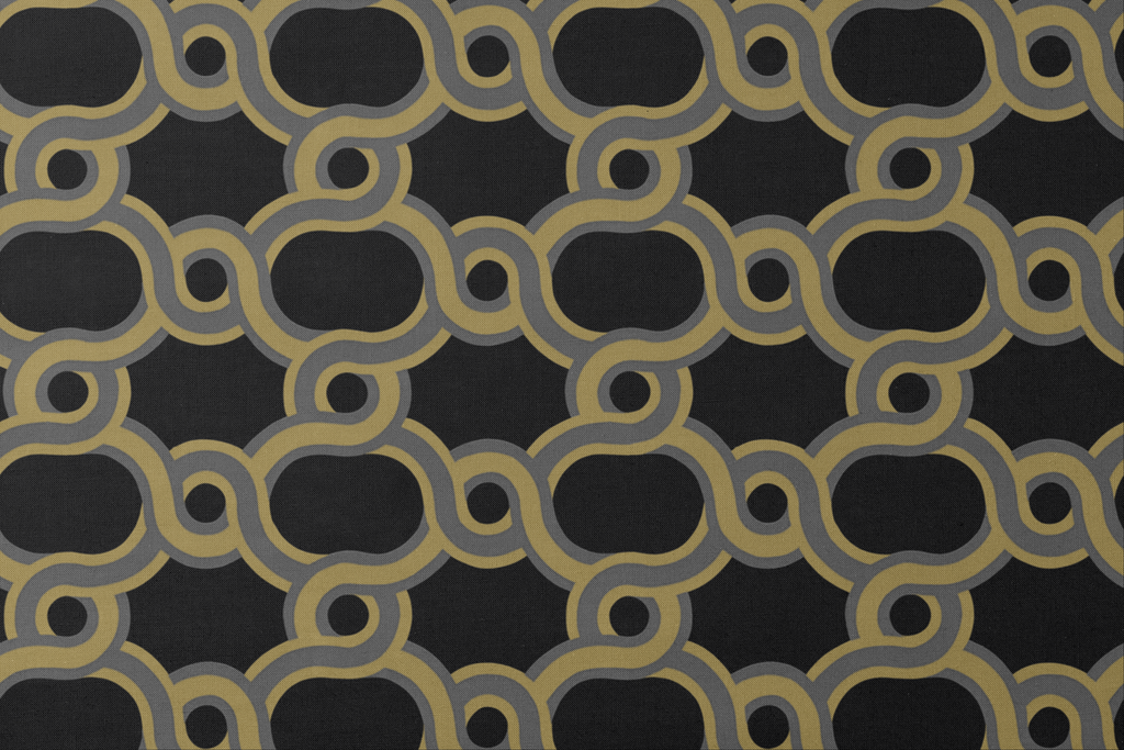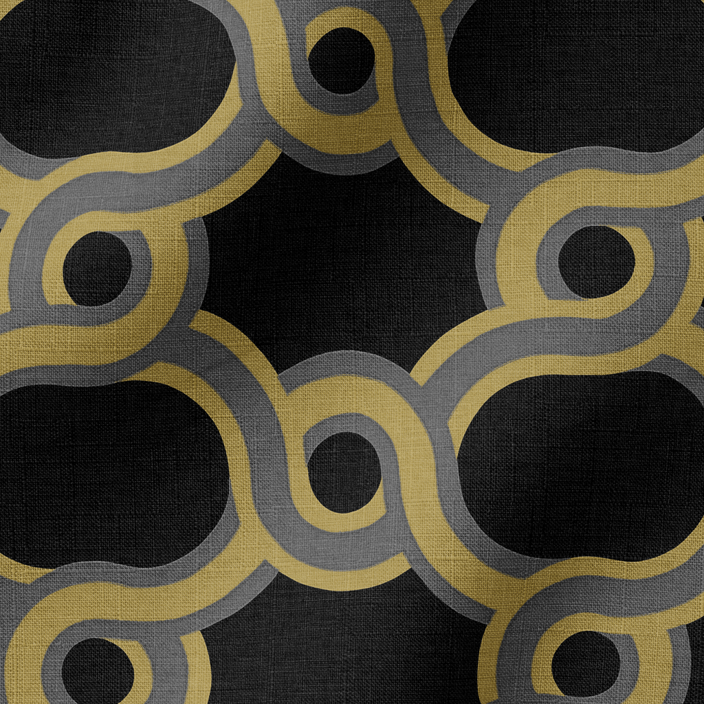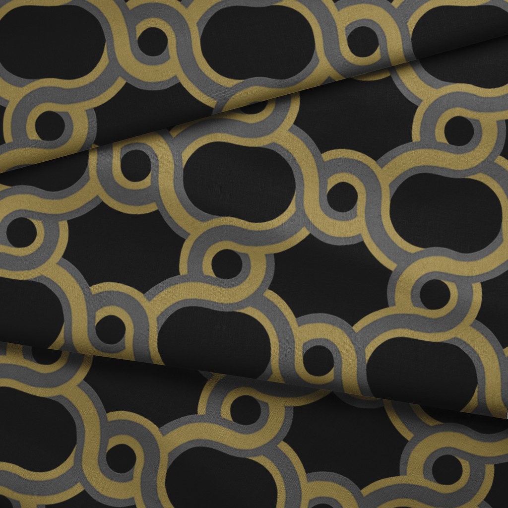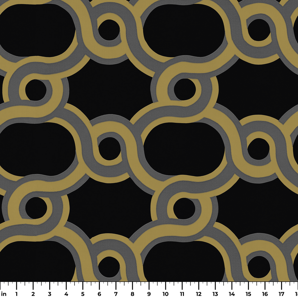 Contemporary geometric pattern with sleek curved lines and intertwining shapes in elegant gold and gray against a rich black background, creating a sophisticated modern aesthetic.