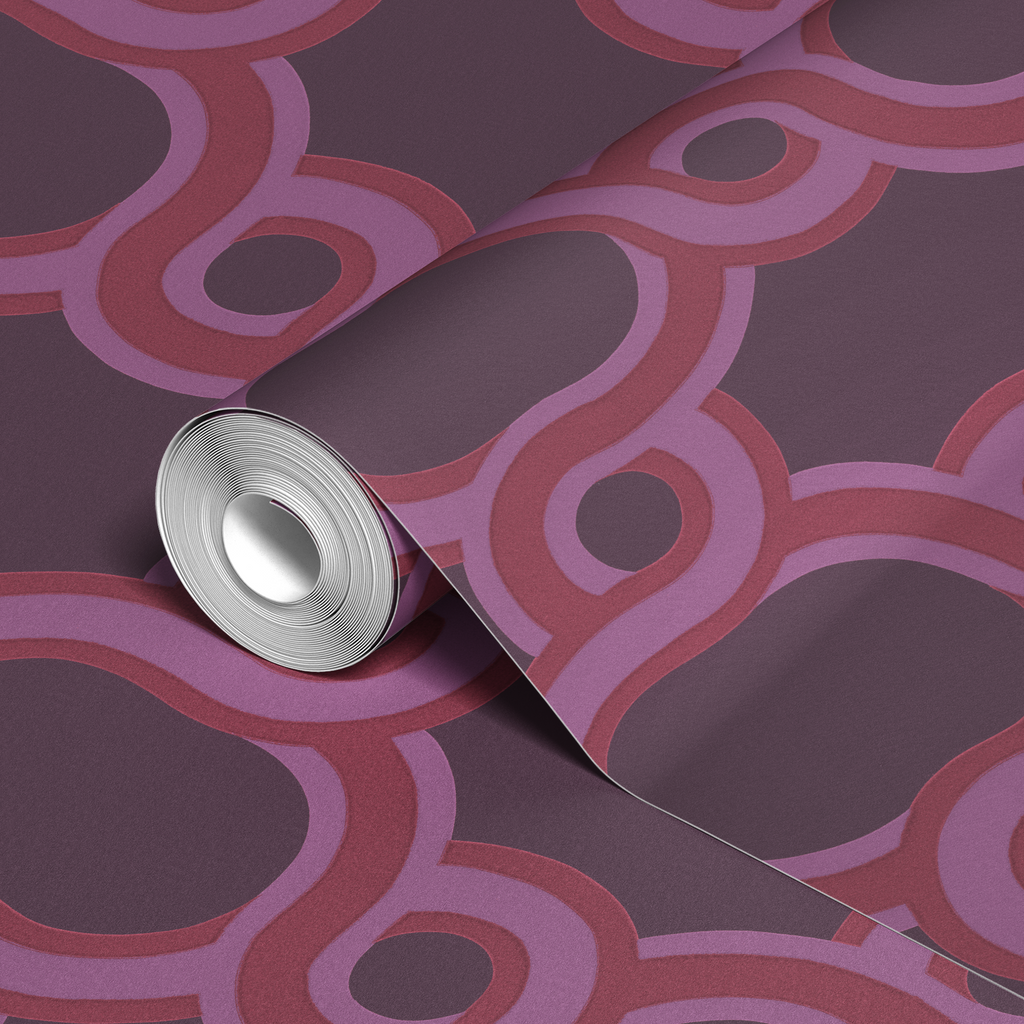 Retro geometric swirls pattern featuring interlocking curves in rich burgundy and purple tones on a deep chocolate background. Perfect for home decor or upholstery with a vintage flair.