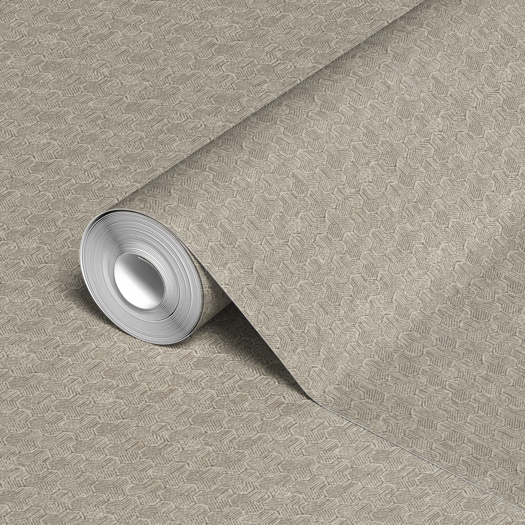 Elegant neutral geometric pattern featuring interlocking hexagons and linear details in a soft taupe colorway. Perfect for sophisticated spaces with a contemporary yet timeless appeal.