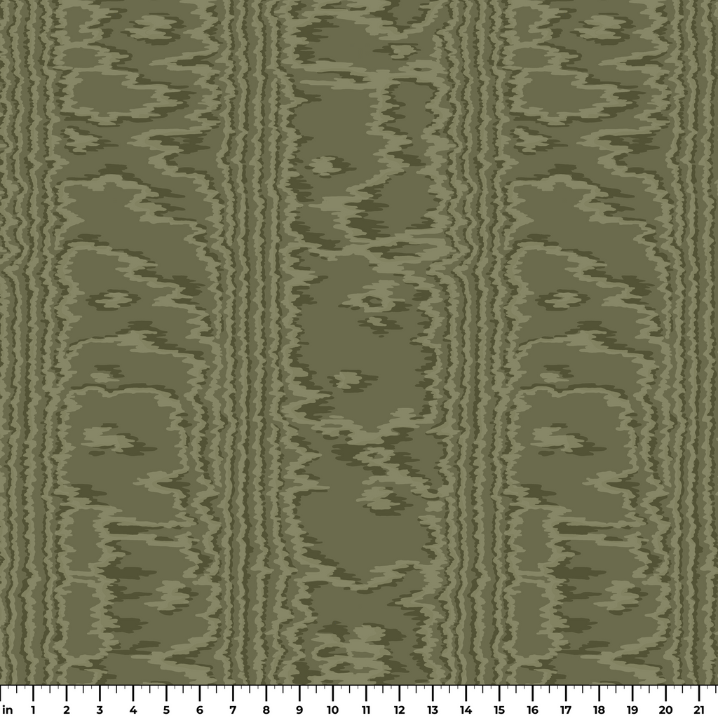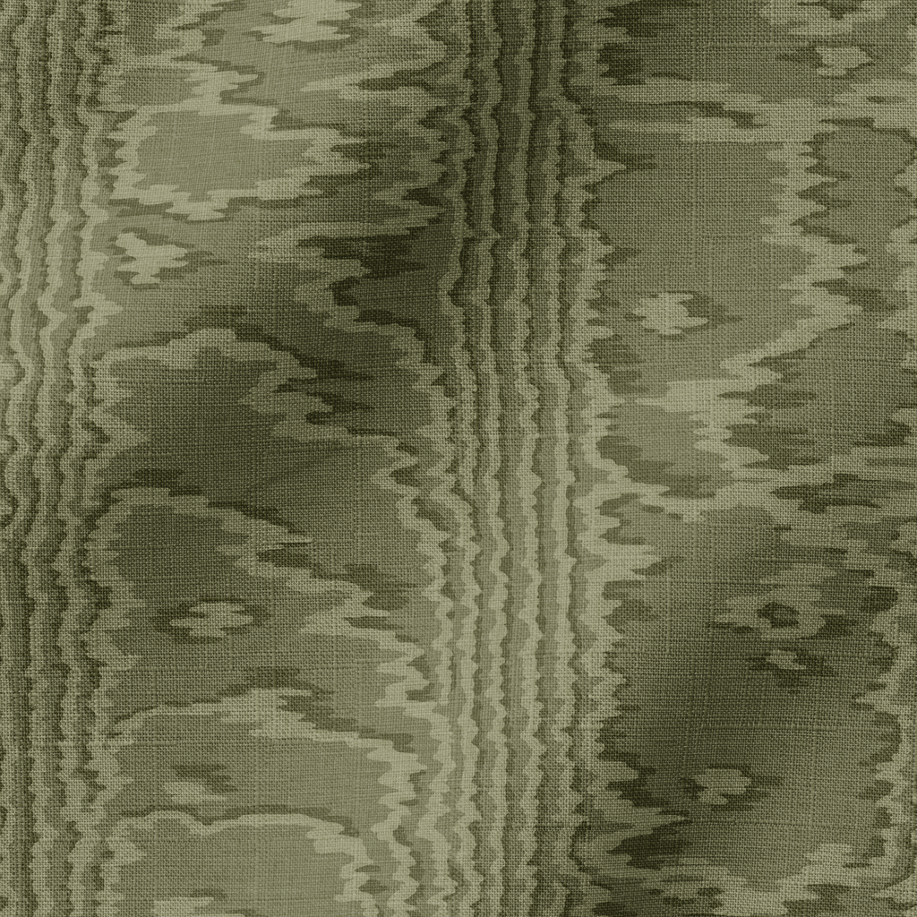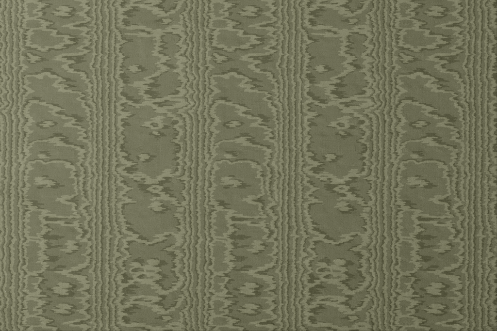 Sophisticated olive green moire fabric with a wavy, textured pattern that adds elegant depth and movement to home decor, upholstery, or formal wear.