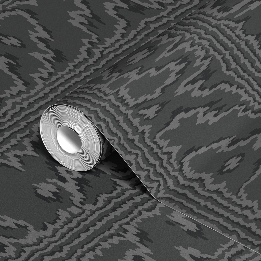 Modern abstract wavy pattern in black and gray with vertical striped design creates a sophisticated contemporary look perfect for elegant home decor or formal upholstery applications.
