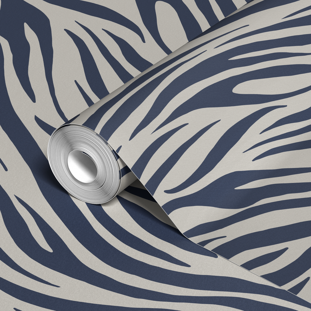 Contemporary navy and cream zebra-inspired pattern featuring flowing organic shapes and curved lines, creating a modern take on classic animal print with a sophisticated, abstract aesthetic.