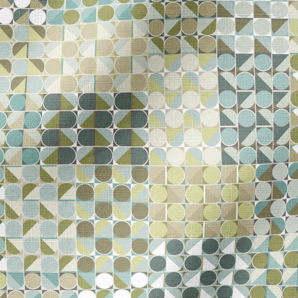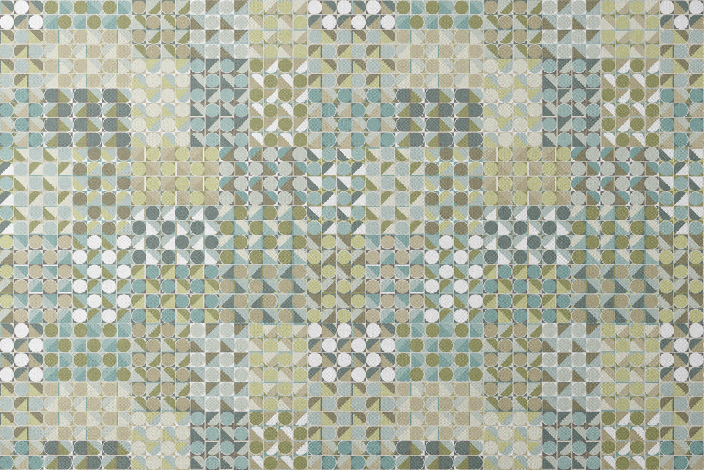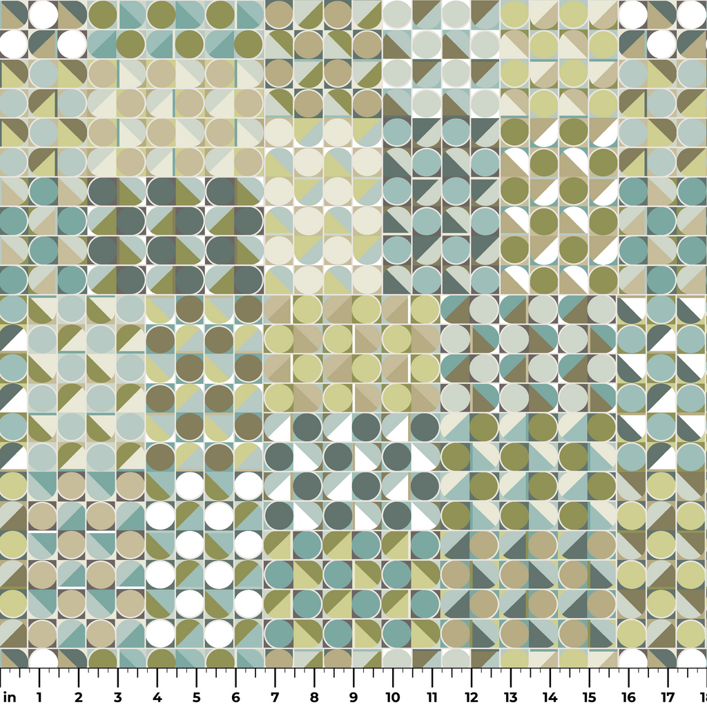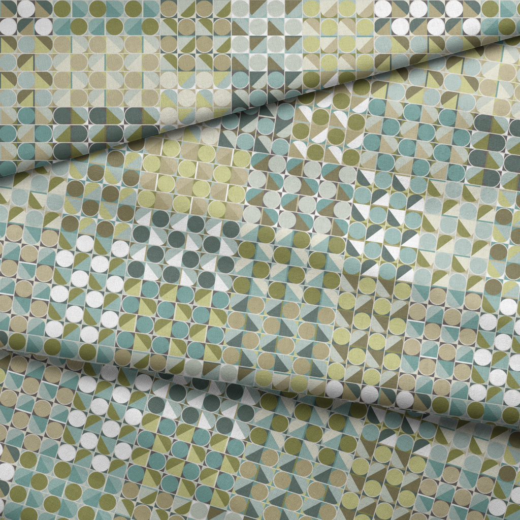 This captivating geometric mosaic tile pattern features soothing sage green, soft blue and cream circular elements arranged in varying patterns, creating a tranquil mid-century modern aesthetic perfect for contemporary spaces.