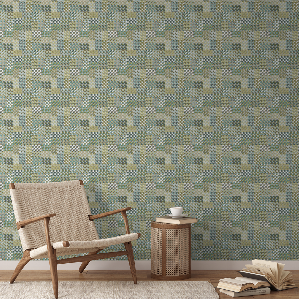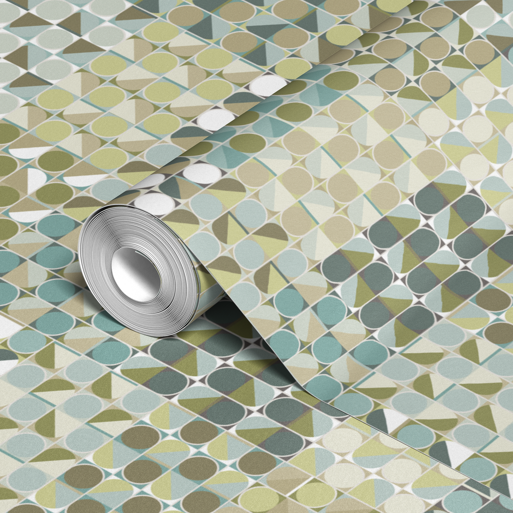 This captivating geometric mosaic tile pattern features soothing sage green, soft blue and cream circular elements arranged in varying patterns, creating a tranquil mid-century modern aesthetic perfect for contemporary spaces.