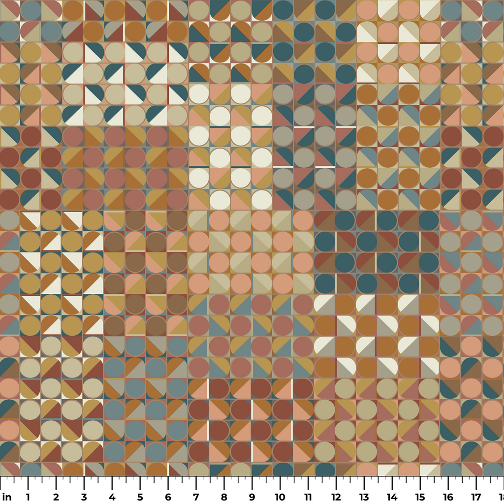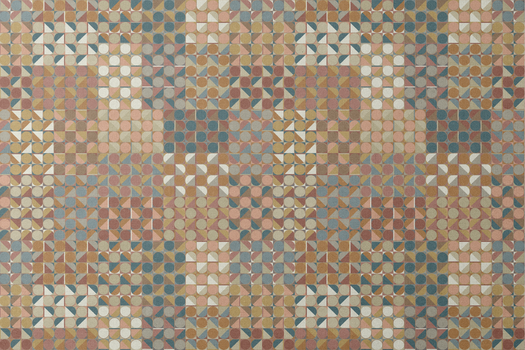 This captivating geometric mosaic tile pattern features soothing red, blue and cream circular elements arranged in varying patterns, creating a tranquil mid-century modern aesthetic perfect for contemporary spaces.